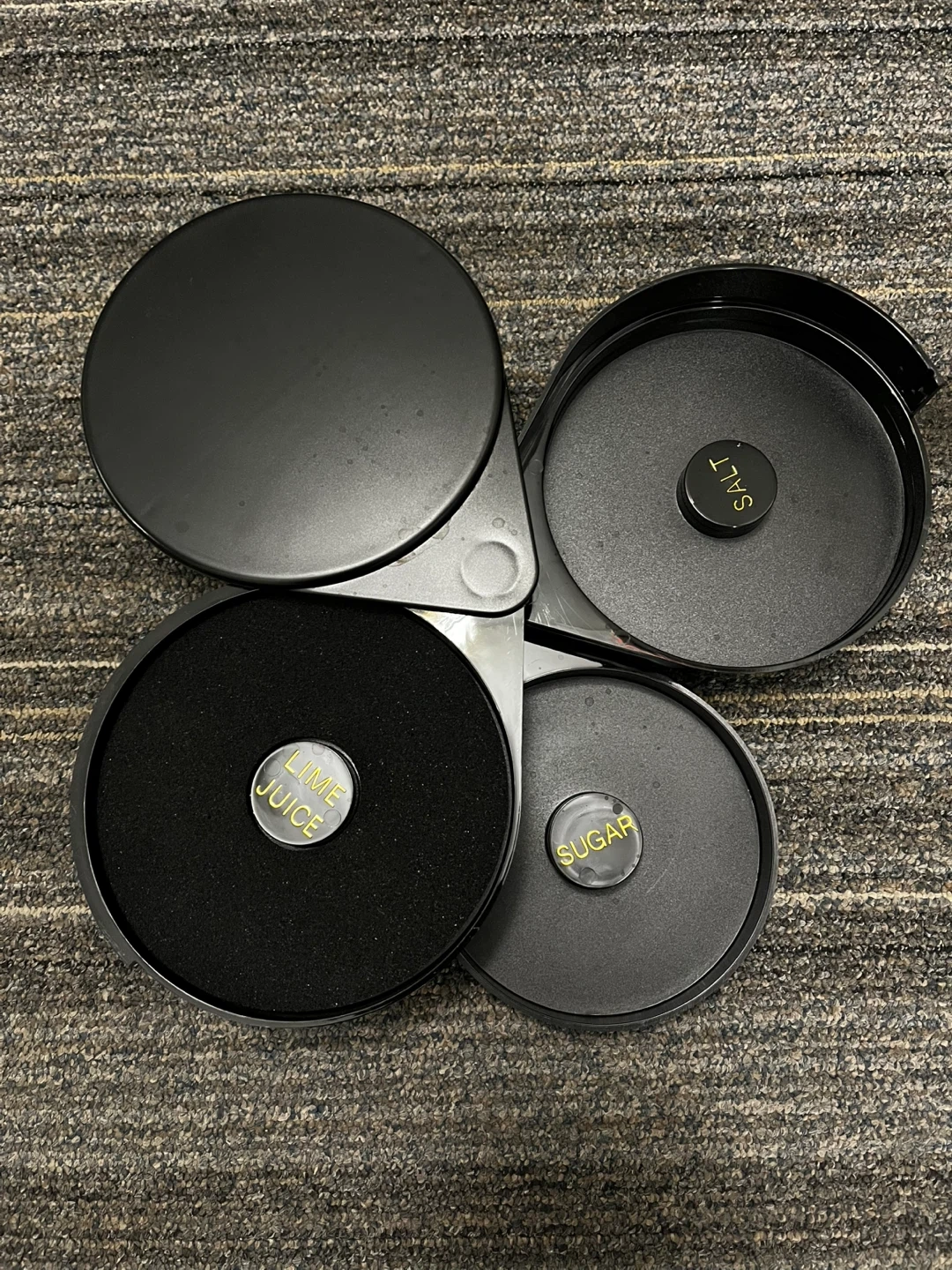 🖤cocktail condiment caddy in black! It features compartments for salt, sugar, and lime juice, making it perfect for your home bar setup