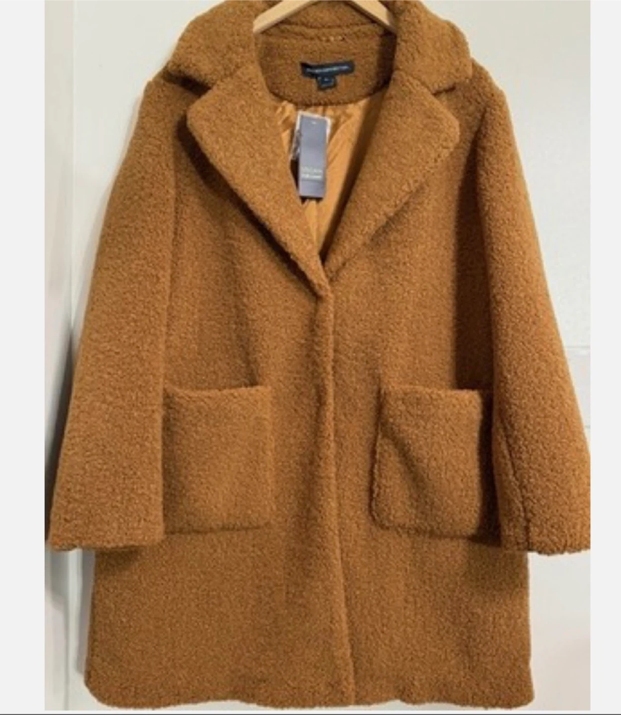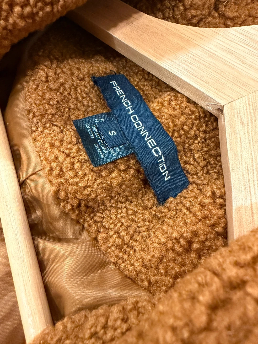 Cozy up in this stylish French Connection teddy coat! It's a beautiful brown color and a size small. Perfect for adding a touch of warmth and flair to your wardrobe.