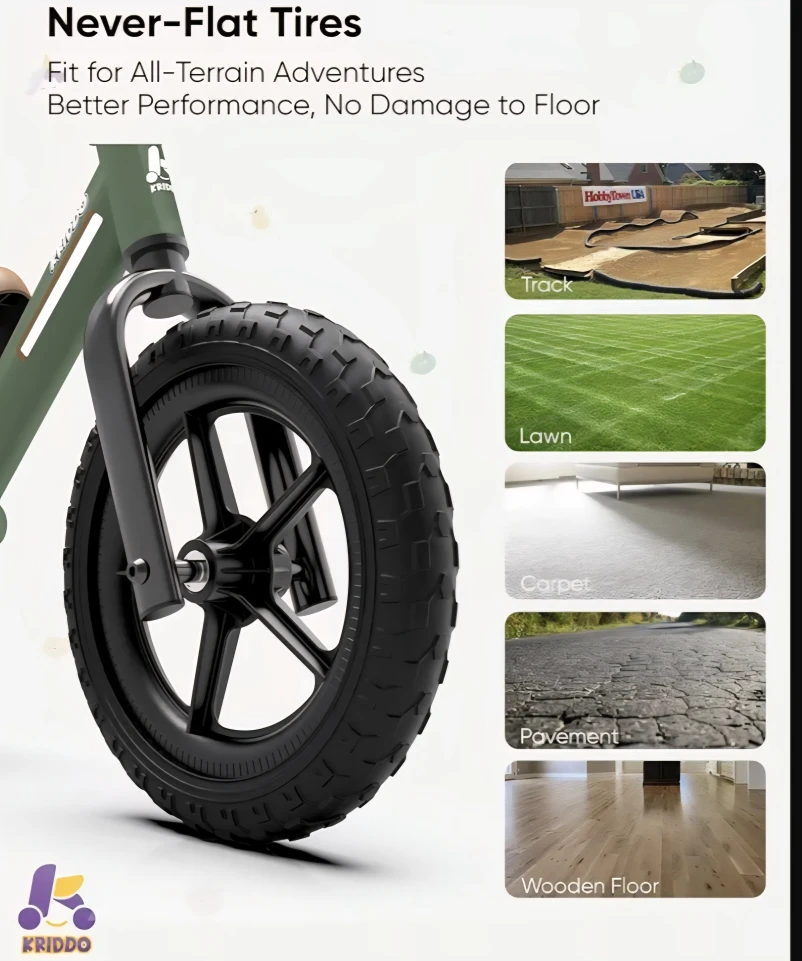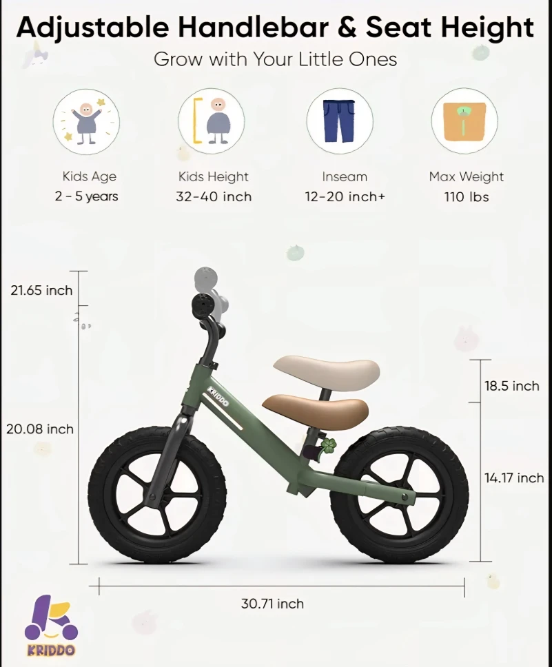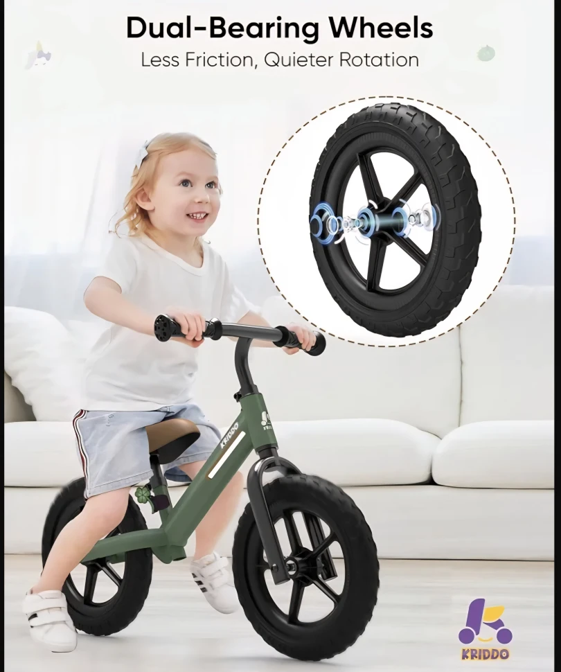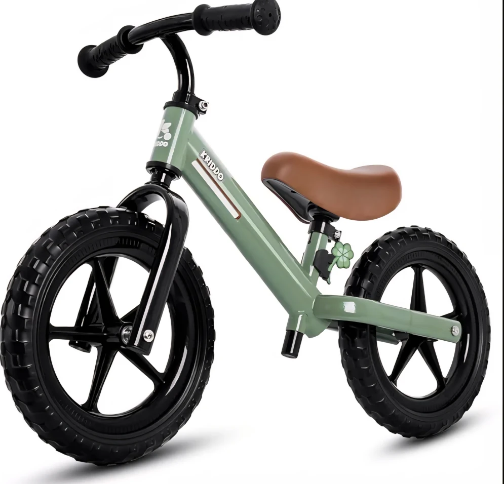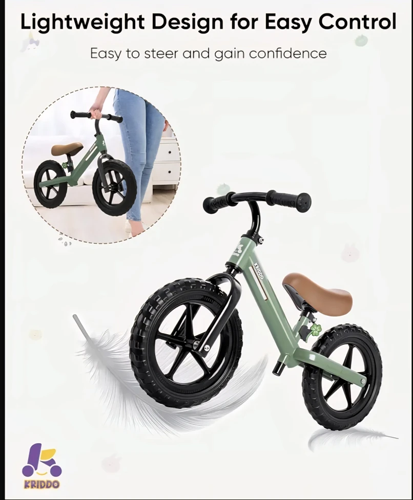 BNIB KRIDDO balance bike. It's perfect for kids learning to balance before transitioning to a pedal bike. The bike is a nice green color with a brown seat. It's lightweight and portable, making it easy to take to the park or store at home