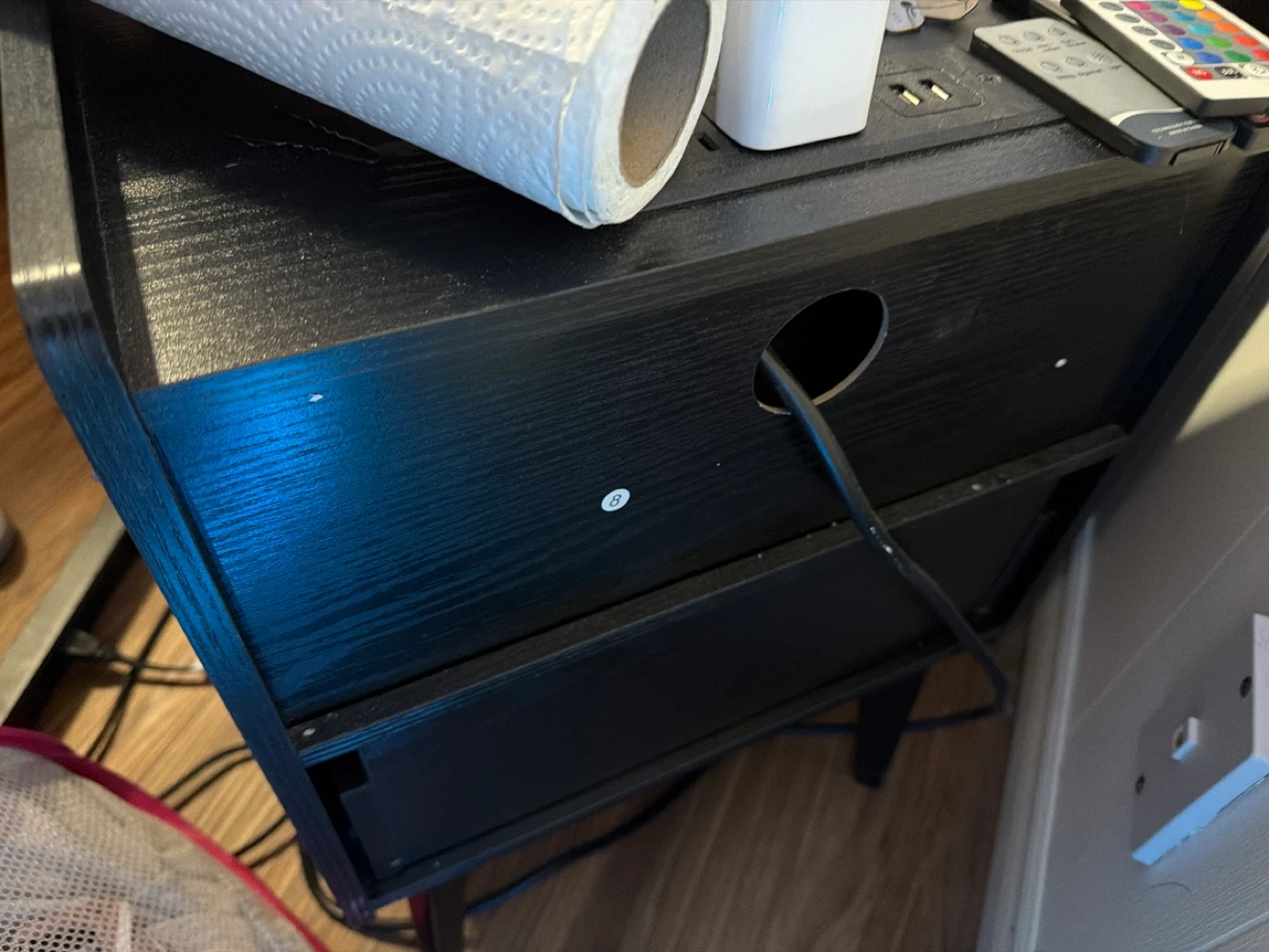 This black nightstand is perfect as an end table or bedside table. It features two USB ports and two power outlets, so you can easily charge your devices. The dimensions are approximately 14.96" x 11.8" x 23.3".