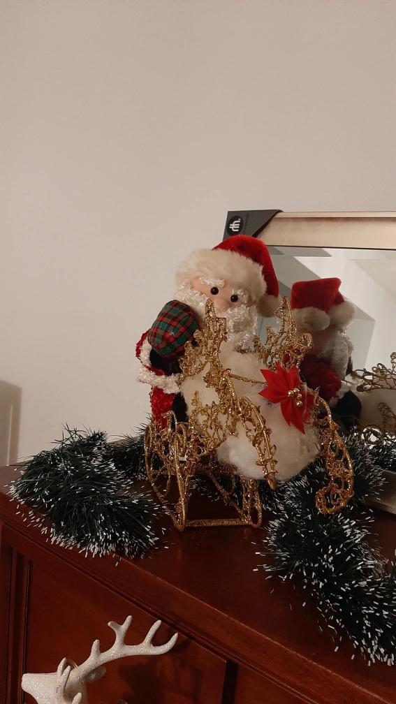 A cute Santa Claus figurine riding on a golden sleigh, perfect for adding a festive touch to your home this Christmas season! The Santa is wearing a red hat and suit and has a fluffy white beard. The sleigh is decorated with a red poinsettia flower. It would look great on a mantelpiece or as part of a table centrepiece