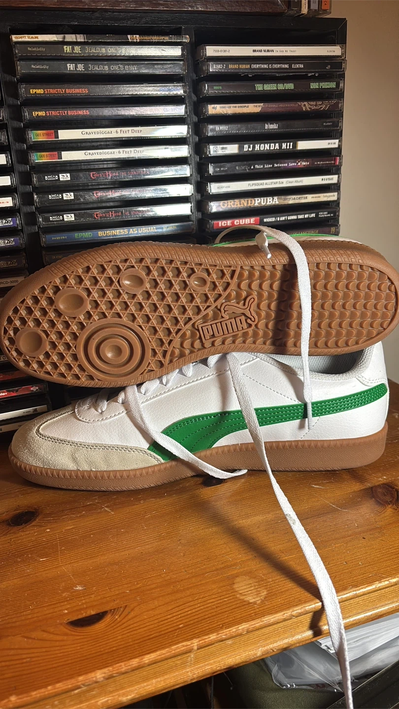 Selling a pair of Puma Club sneakers in white and green! These stylish sneakers are in great condition and ready for a new home. They feature a classic design with the iconic Puma stripe. Perfect for everyday wear!