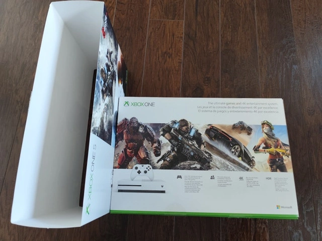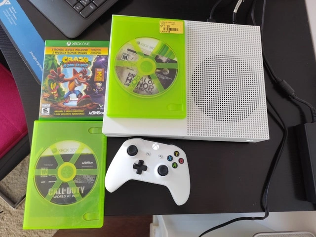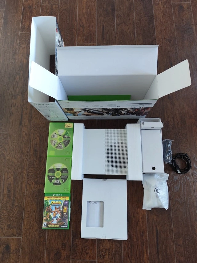 Like new In Box Xbox One S, comes with original controller and all cables, rarely played basically new. Some games: - Crash Bandicoot N. Sane Trilogy - Resident Evil: Revelations 2 - Call of Duty: Warzone - Call of Duty: The Hunting - Rocket League - Asphalt Legends Unite - Hitman 3 - The Sims 4 - Fall Guys - Roblox - Trackmania - World of Tanks - world of warships - War Thunder - Fortnite - APEX. Let me know if you're interested!