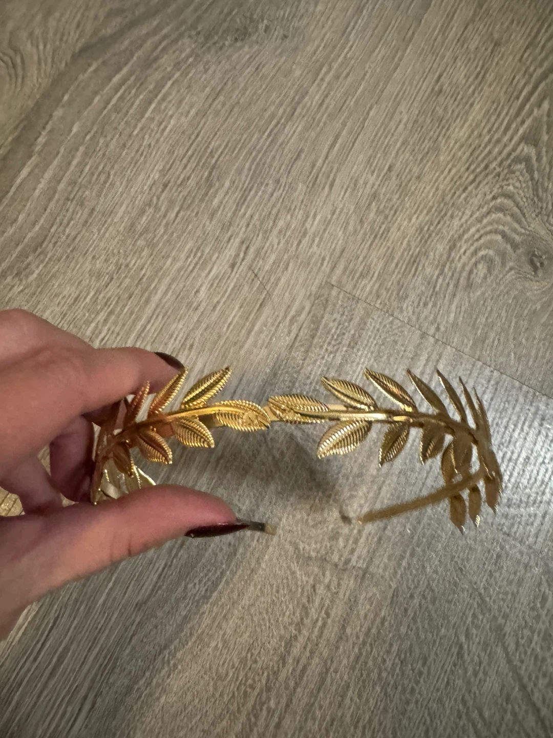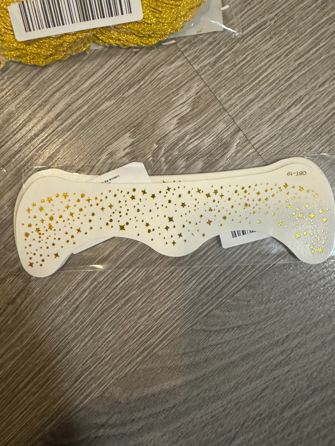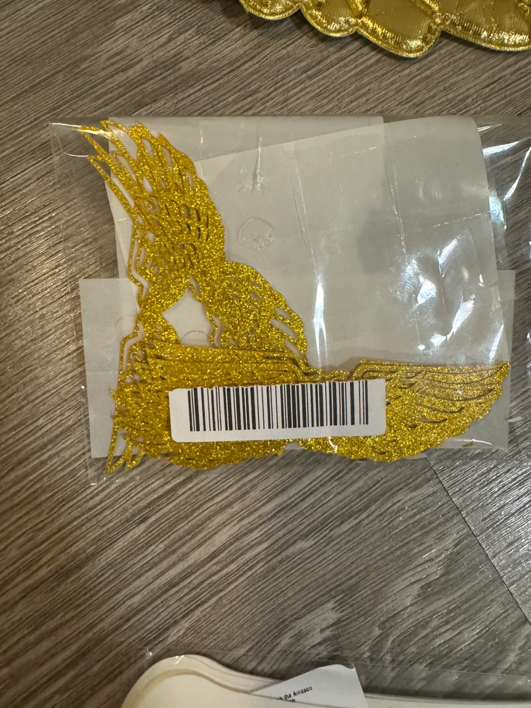 Selling a set of gold costume accessories! Includes wings, a laurel leaf headband, and face tattoos.