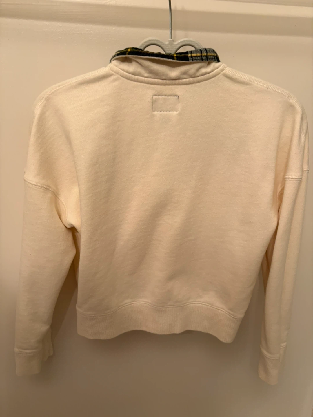 Cozy Roots Kids cream-coloured sweatshirt in size L/G. Features a quarter-zip and a plaid collar detail. Perfect for layering!