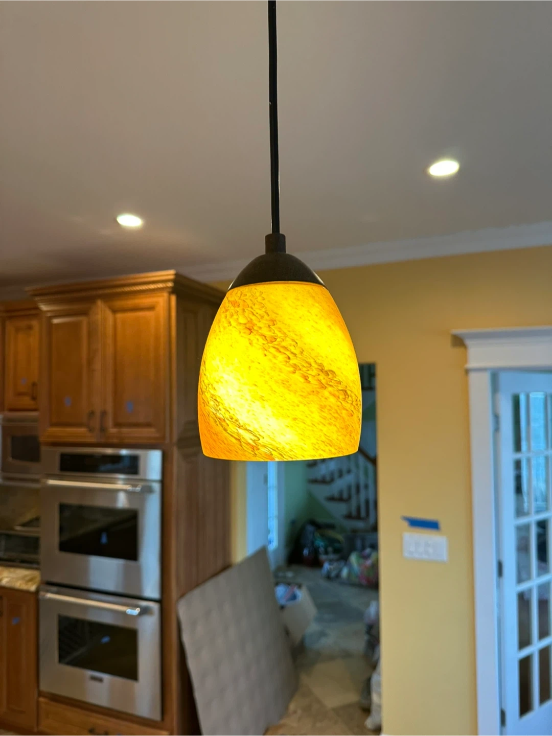 They have a unique yellow swirl design and would look great over a kitchen island or bar area. They are in good condition and ready to brighten up your space