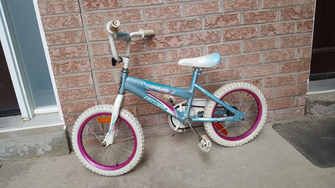 This is a Blue Supercycle Illusion Kids' Bike with a high-tensile steel frame. 16\" (40.6 cm) wheels, Single speed, Coaster brake, Double-guard chain guard.