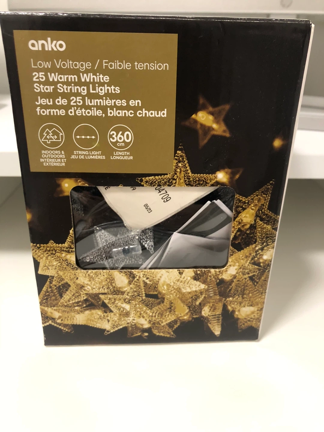 Adorable, versatile for year round, LED star string lights from the discontinued Anko Zellers/Bay brand. Plug in style— no batteries required at all. They provide a beautiful warm glow. Black wire.