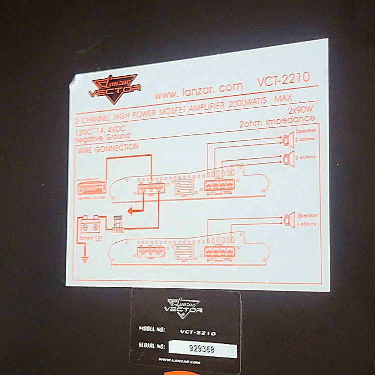 Lanzar Vector (Model: VCT-2210) (Serial: 929368) 2 channel Mosfet amplifier has 2000 Watts, 2x90 Watts, 2 Ohm independence, negative ground, 12DC 14.4VDC.