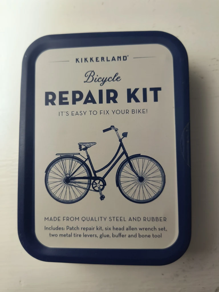 This Kikkerland Bicycle Repair Kit has everything you need to fix your bike. IIncludes a patch repair kit, six head allen wrench set, two metal tire levers, glue, buffer and bone tool. Was a generous gift but never opened or used because I know my limits 🤣 seems to be selling on Amazon for around 40 dollars.