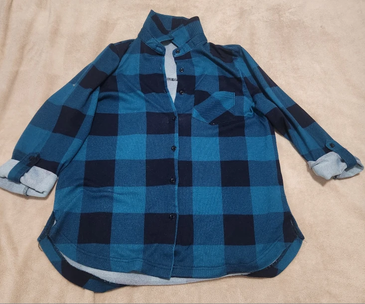 Here's a comfy-looking flannel shirt with a classic green and black plaid pattern. It has long sleeves and a button-up front. Perfect for layering or wearing on its own! You can also wear it with the sleeves up or down.