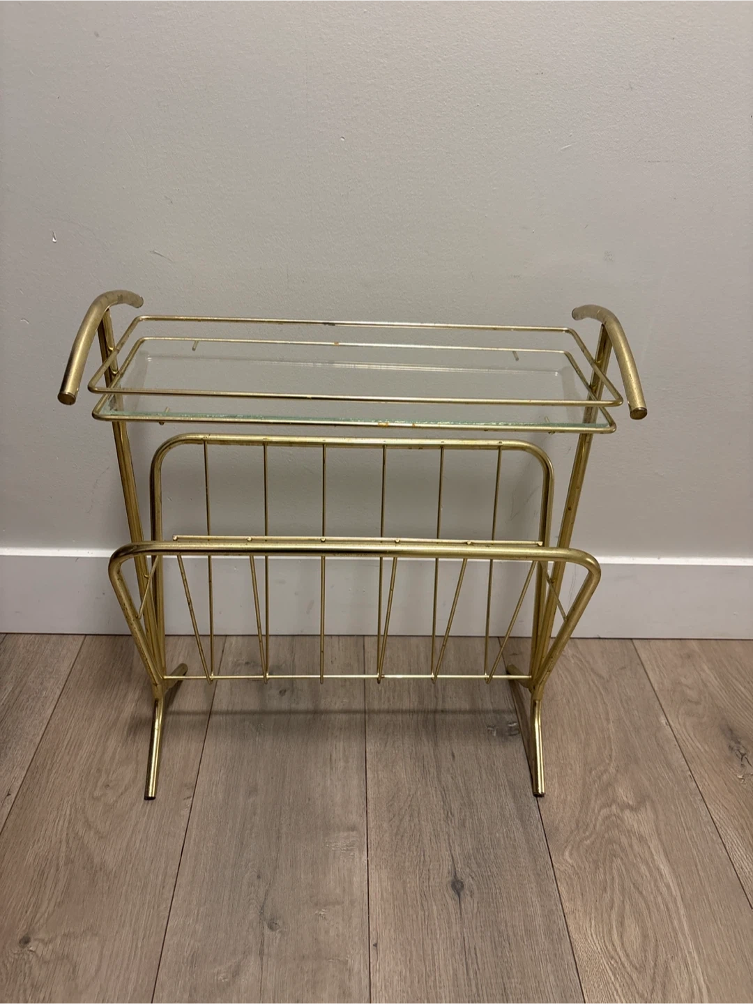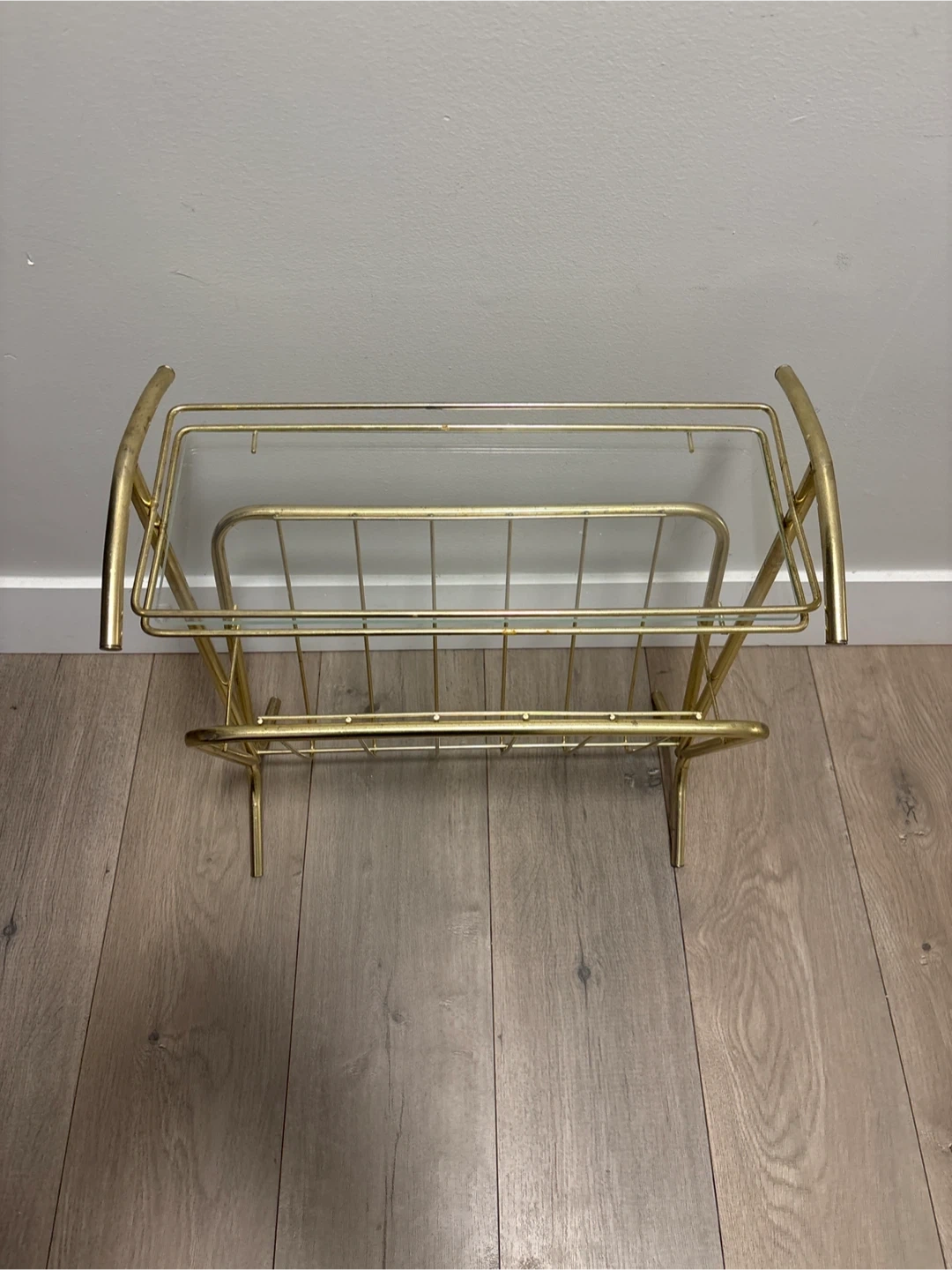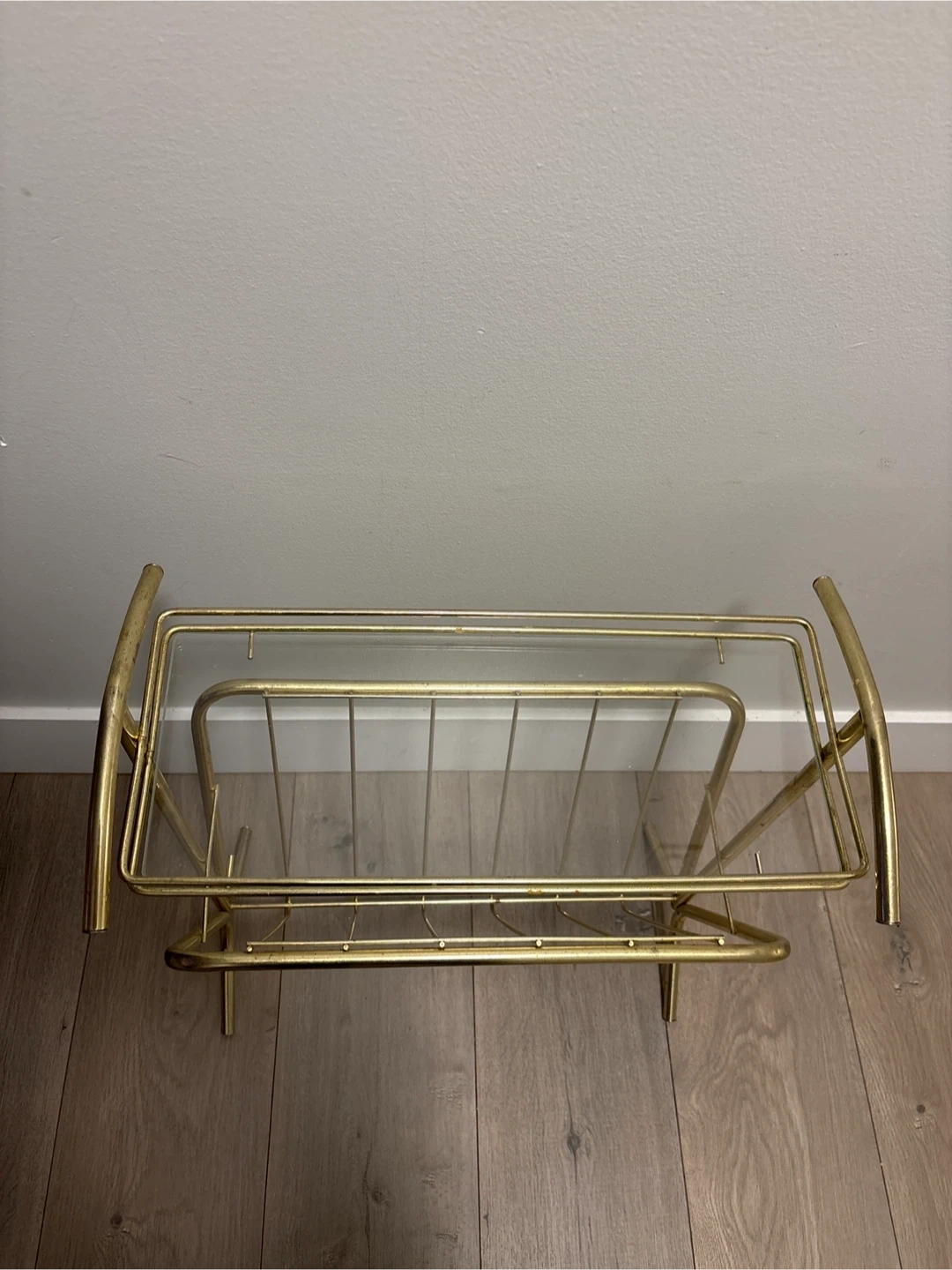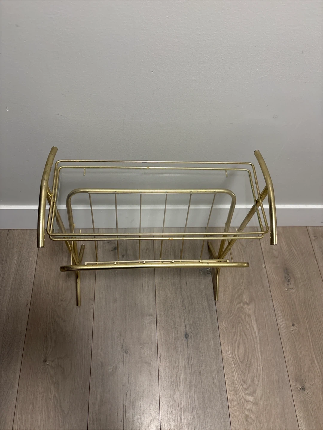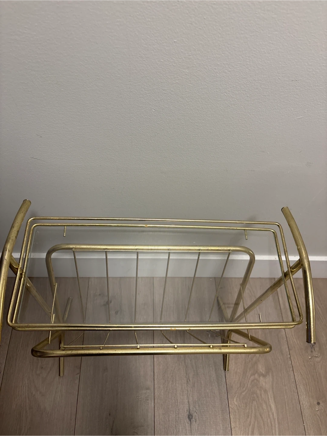 Selling a brass magazine rack with frame and a glass top. It's in good condition and would be a stylish addition to any living room or office space
