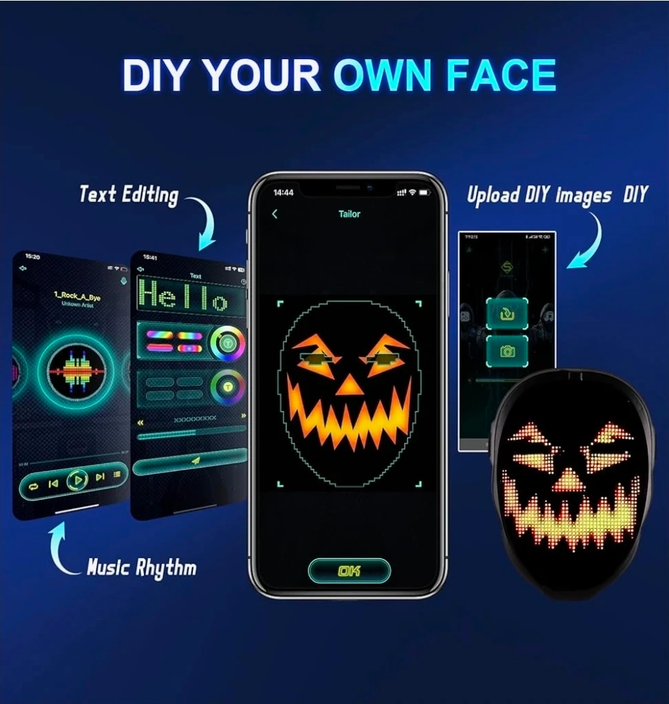 Check out this Shining App Mask! It's a fun DIY face mask that lets you customize your own face with text editing, uploaded images, and even music rhythm