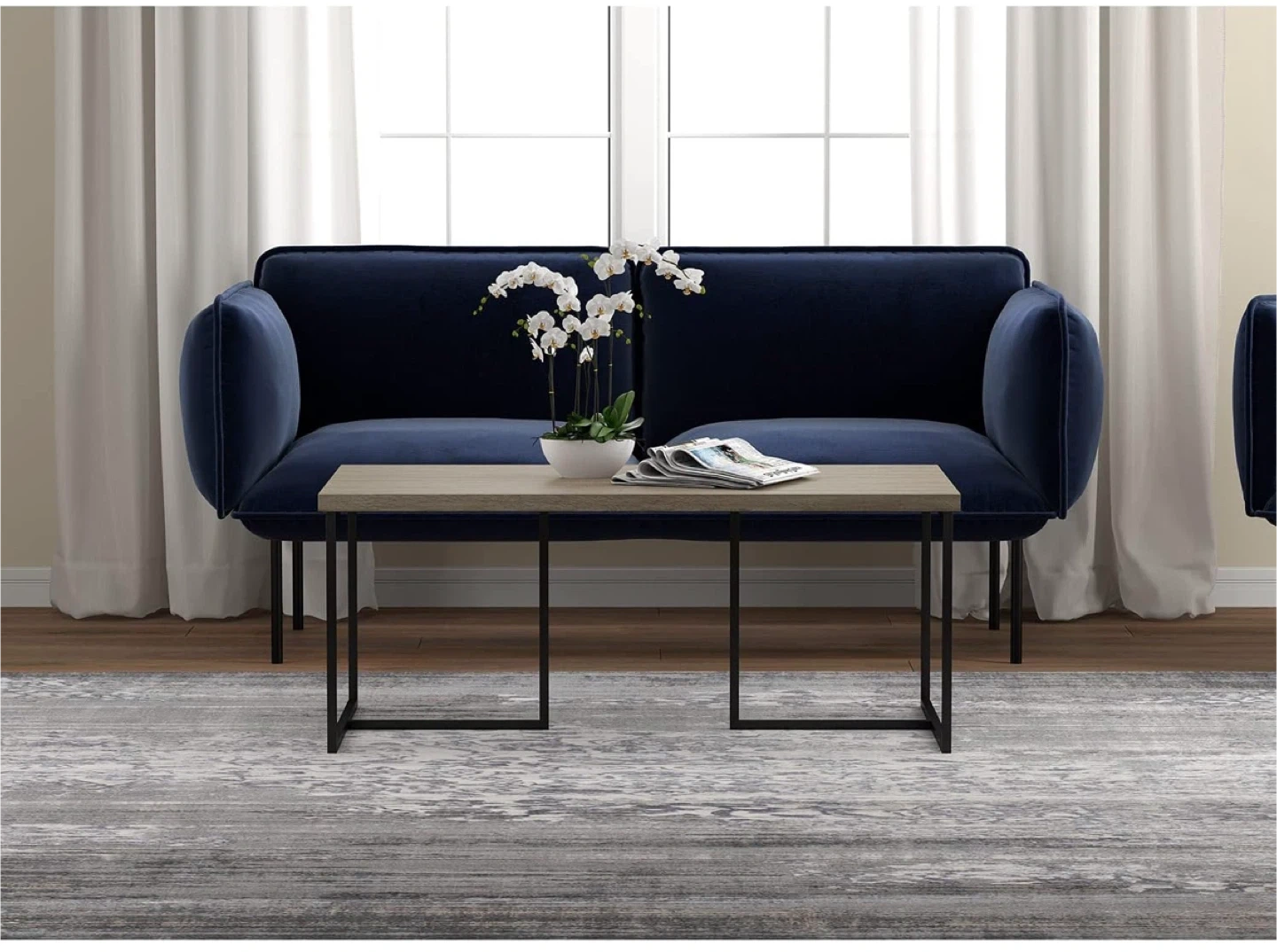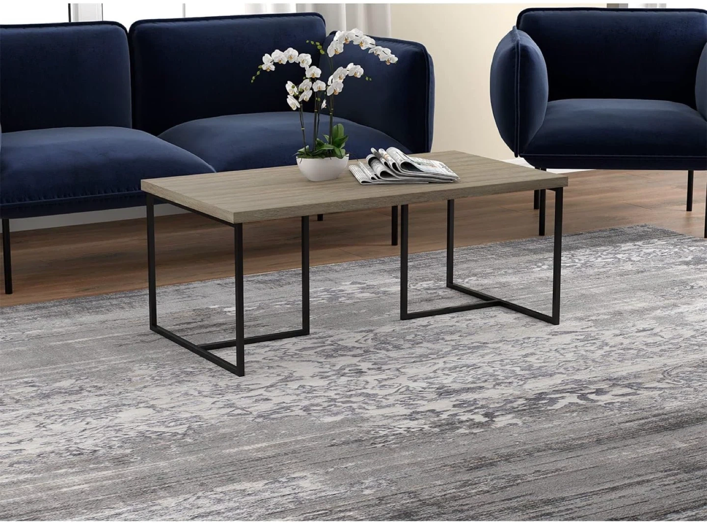 Selling a coffee table with a light wood-look top and a black metal frame. It's in great condition and would look great in any living room or den.