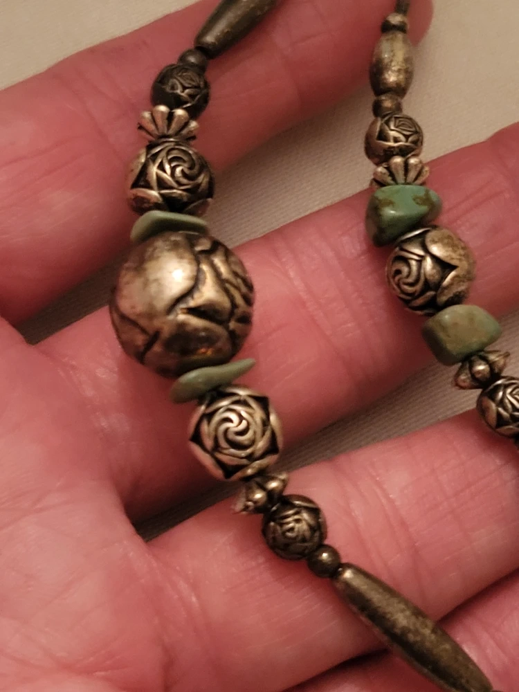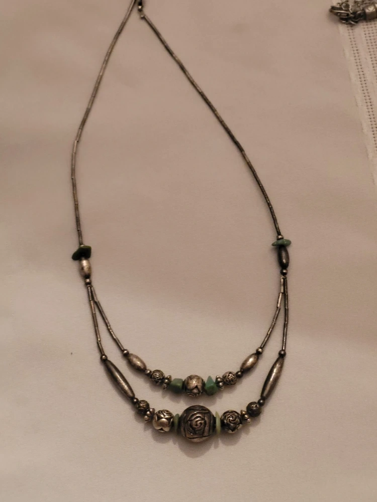 Here's a lovely vintage necklace featuring silver-tone beads and turquoise accents! It's a double-strand piece with unique rose-patterned beads. Perfect for adding a touch of vintage charm to any outfit!
