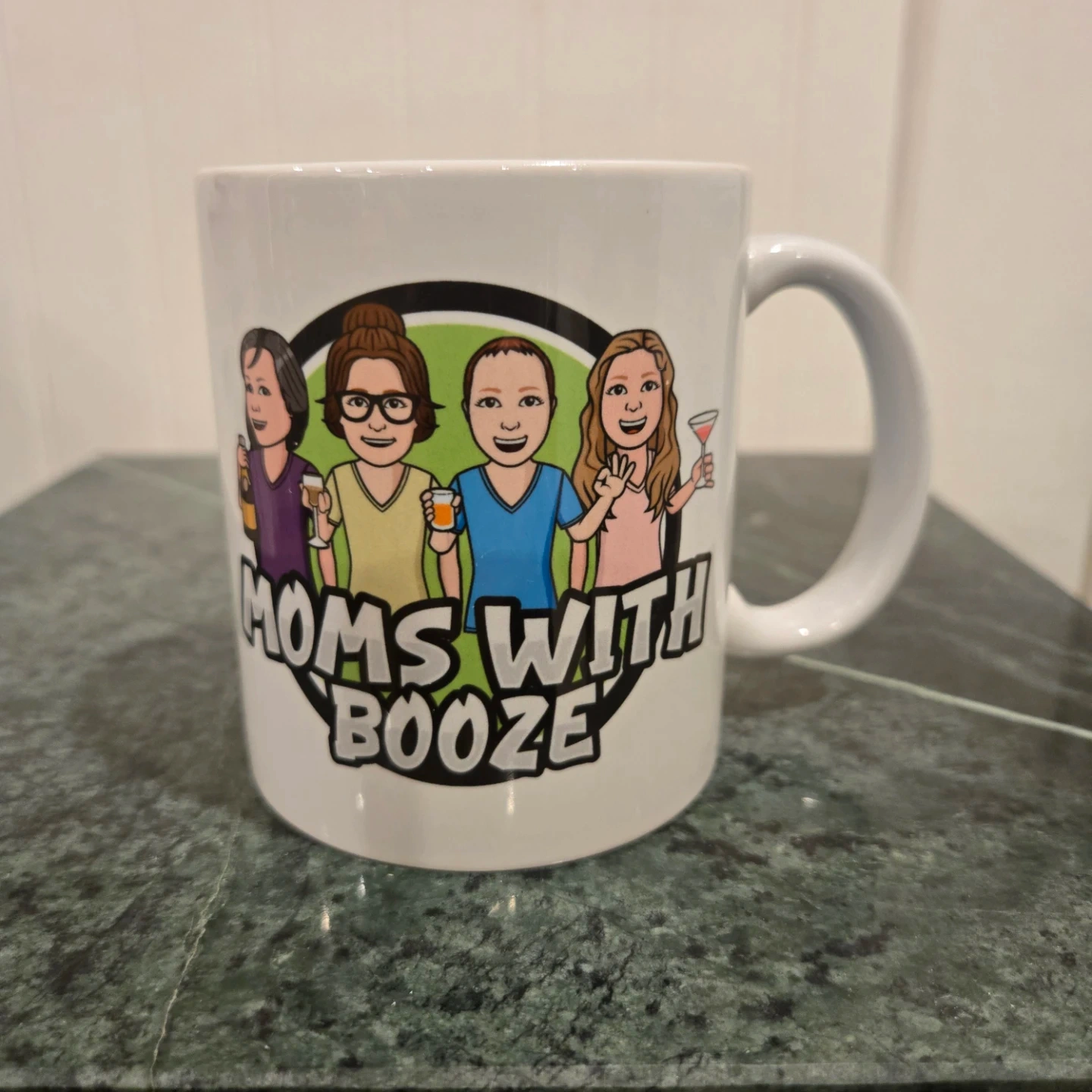 A fun coffee mug featuring a cartoon of moms enjoying drinks with the text "Moms With Booze" printed on it! Perfect for a gift or for yourself!