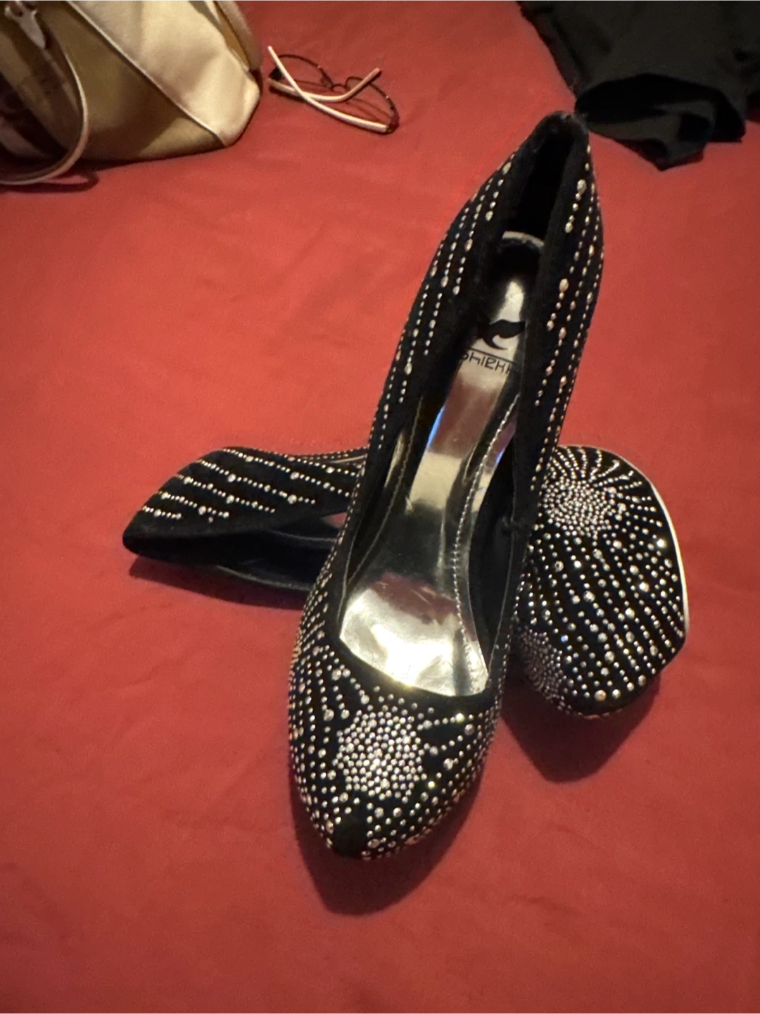 Selling a pair of Sophie brand heeled pumps in size 6.5. They are black and covered in silver studs. They are made of all man-made materials
