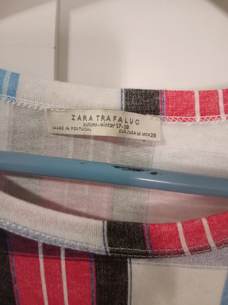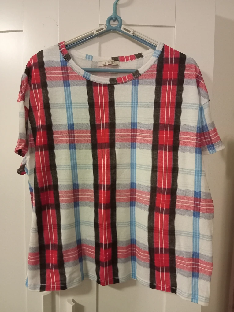Selling a Zara Trafaluc top with a plaid pattern! It's a size M and made in Portugal. The colours are a mix of red, white, blue, and black.