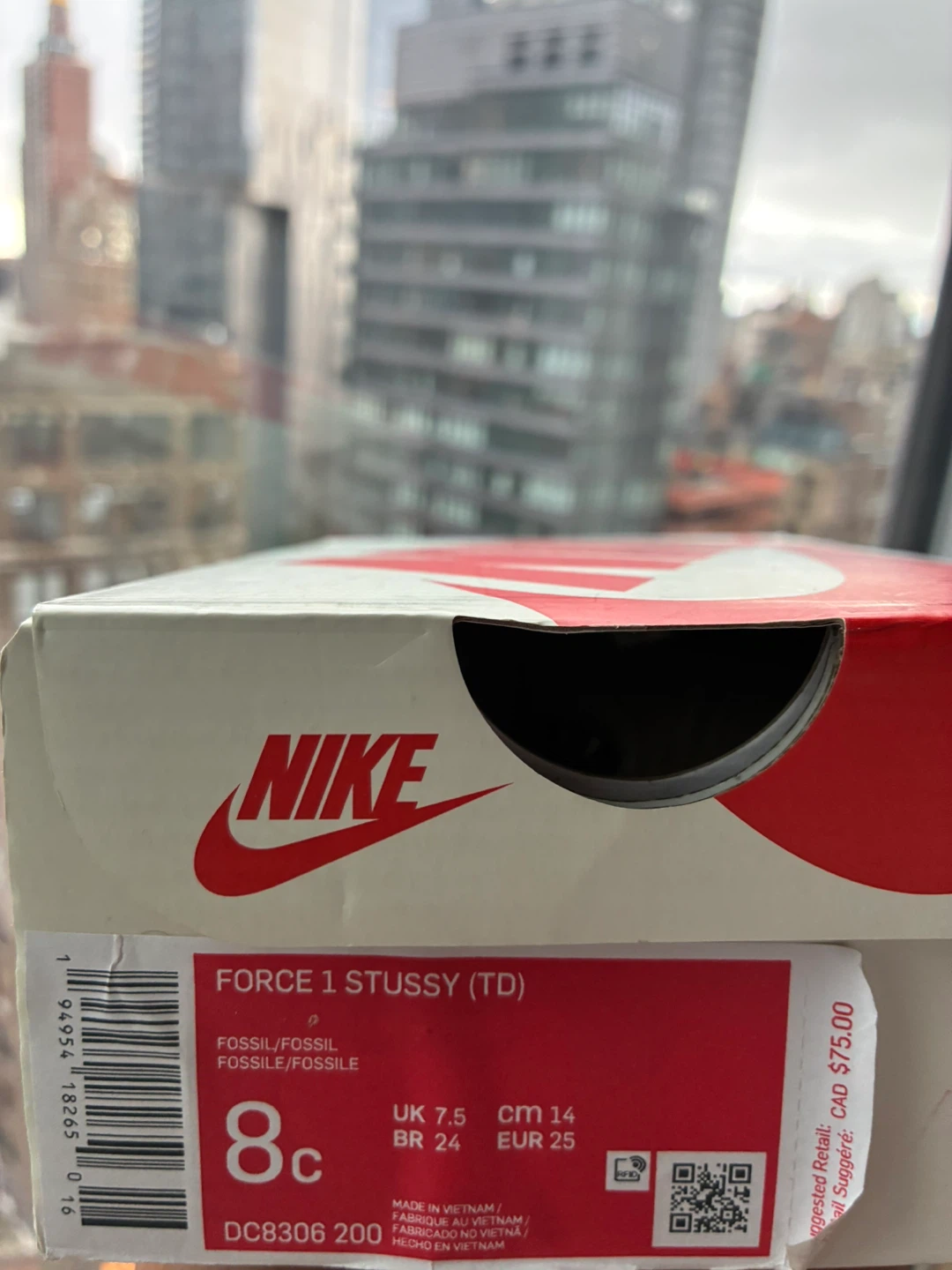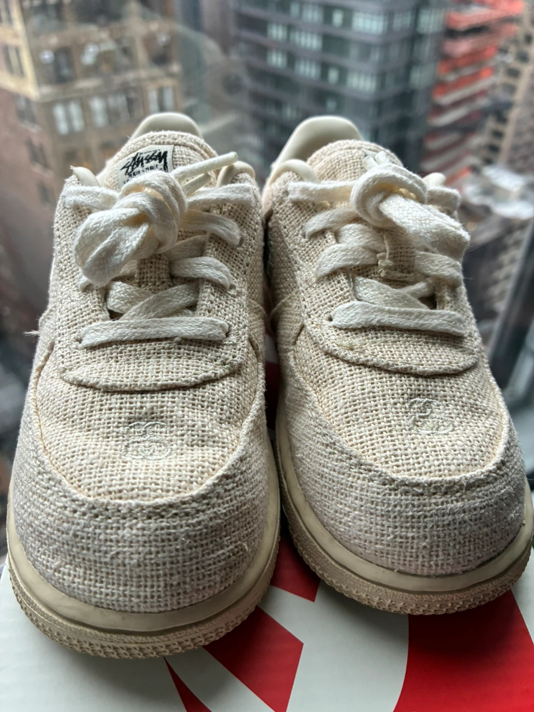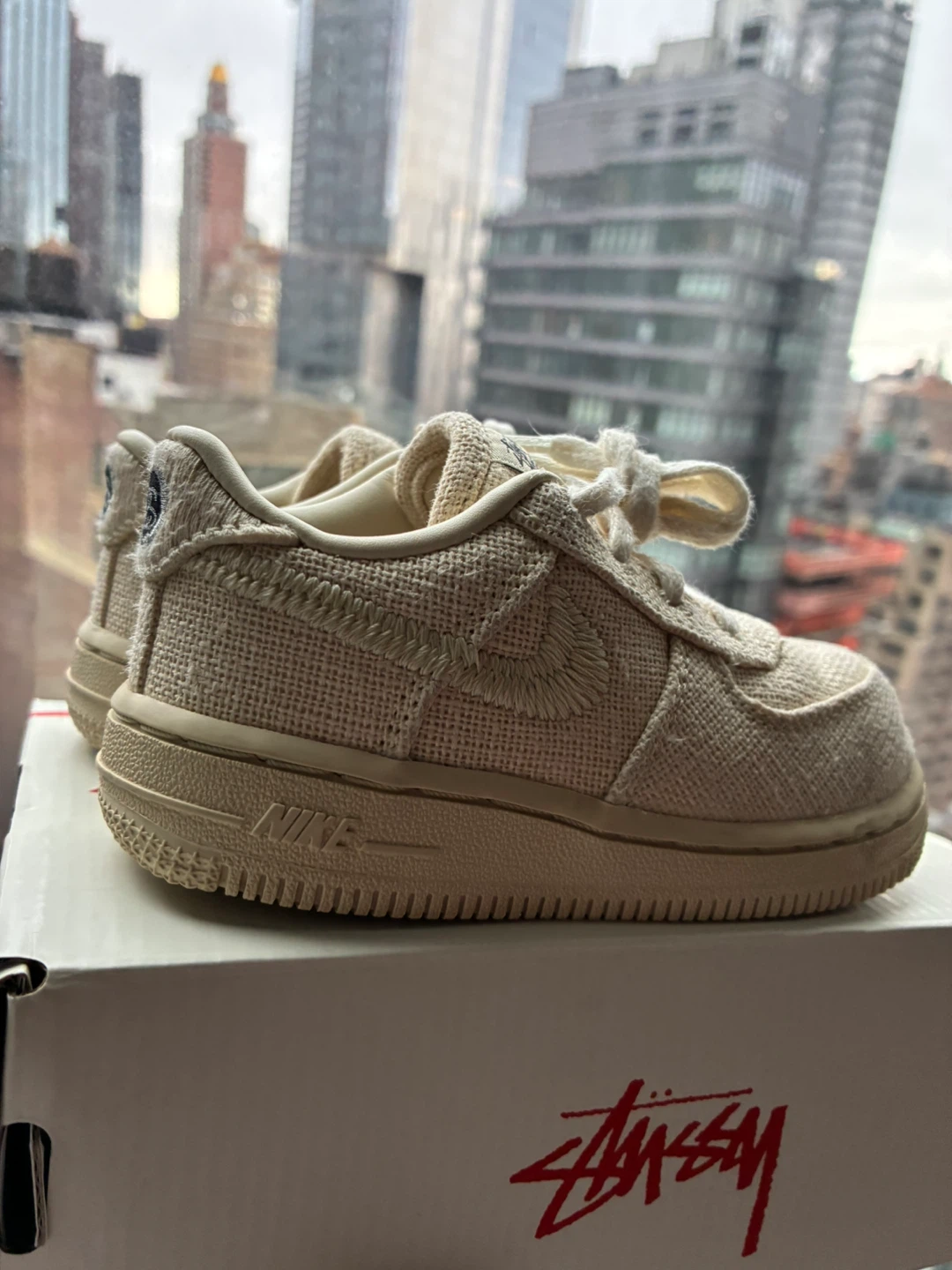 Selling a pair of pre owned but rare kids Nike Air Force 1 in a Fossil Stone color, designed in collaboration with Stussy! These have a unique woven texture and subtle Stussy branding. They come with the original box.