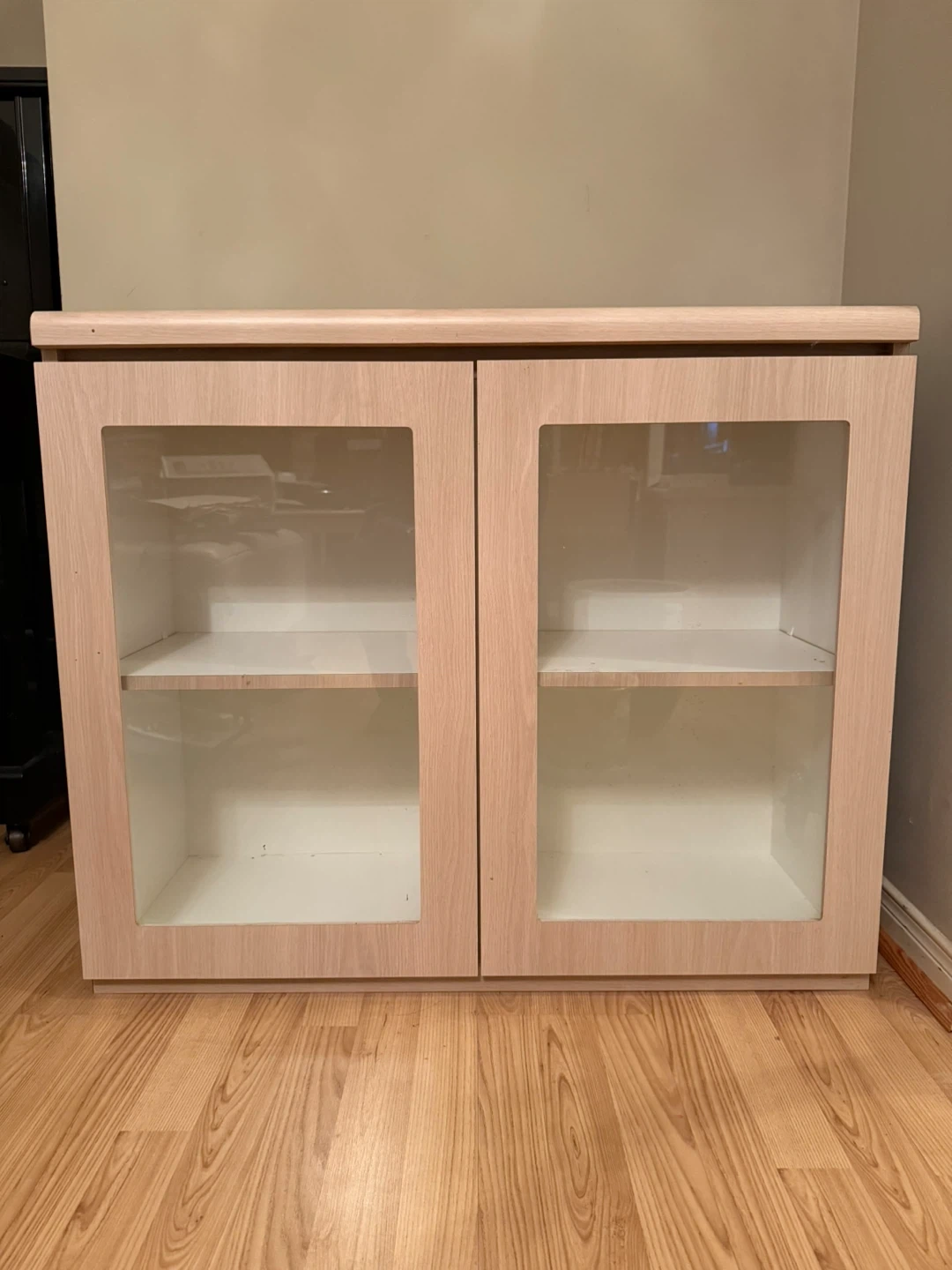 Selling a storage cabinet with glass doors! It's in great condition. It features a light wood frame with white interior shelves. A great addition to any living space or office!