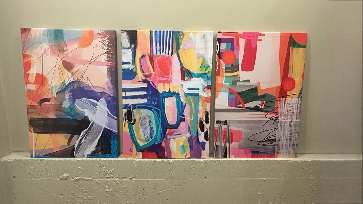 Here's a set of three abstract canvas prints! They would add a pop of colour to any room. Each canvas has a unique design with vibrant colours and interesting shapes. 17.75 x 25.75 inches each piece