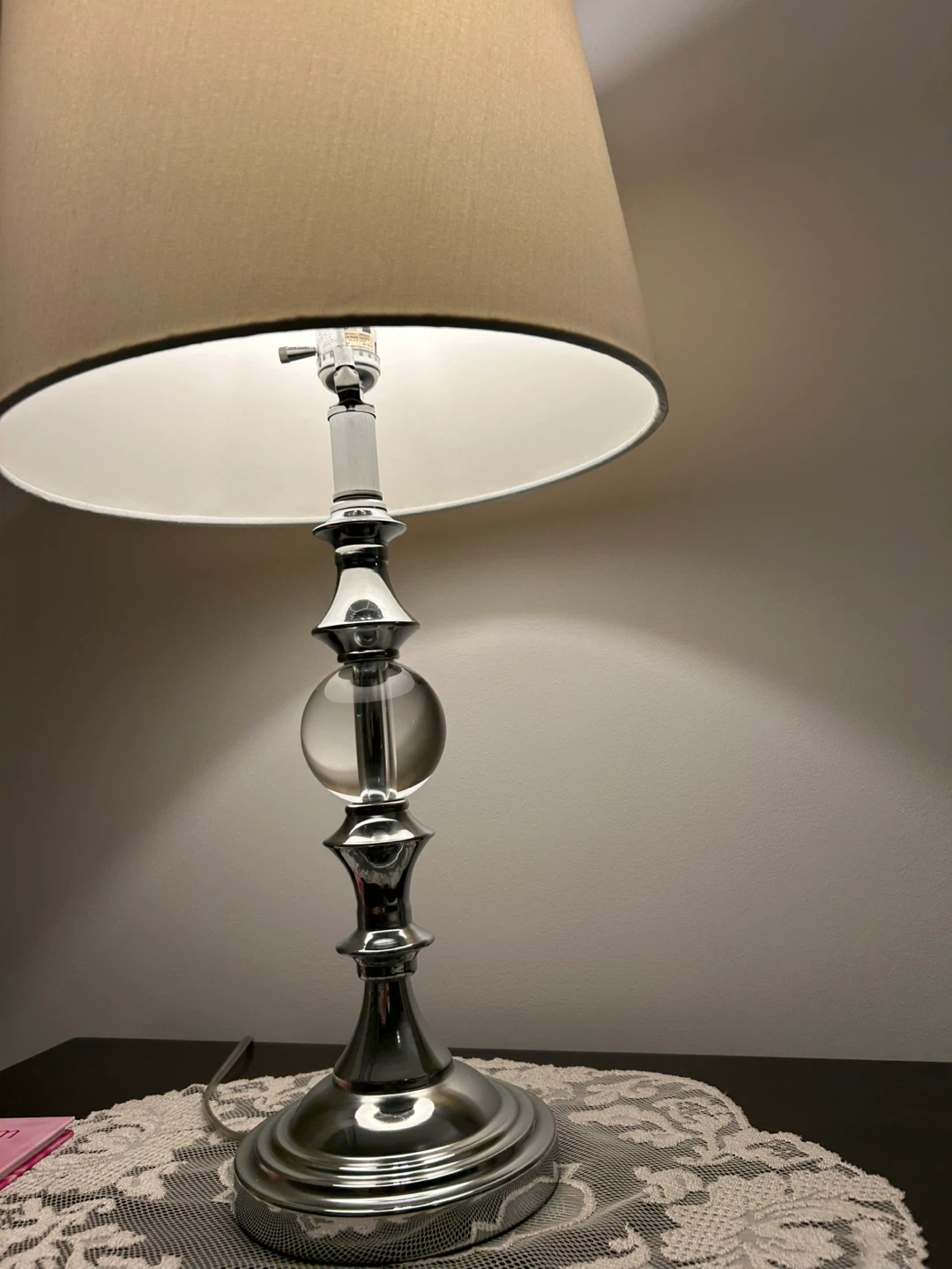 Selling a set of two table lamps. $25 each. They feature a chrome base with a glass ball accent and a neutral-coloured shade. They're in great condition and would look lovely in any room! No damage excellent working condition