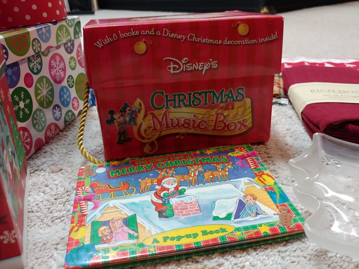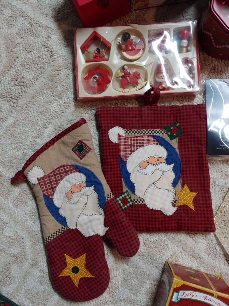 A variety of Christmas decorations and gift bags are available. Includes decorative boxes, gift bags with cat and Christmas tree patterns, tablecloths, a snowglobe, angels, and other festive items to brighten up your holiday season!
