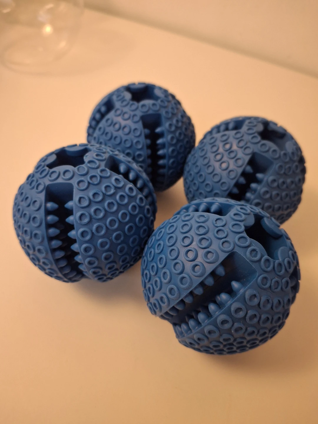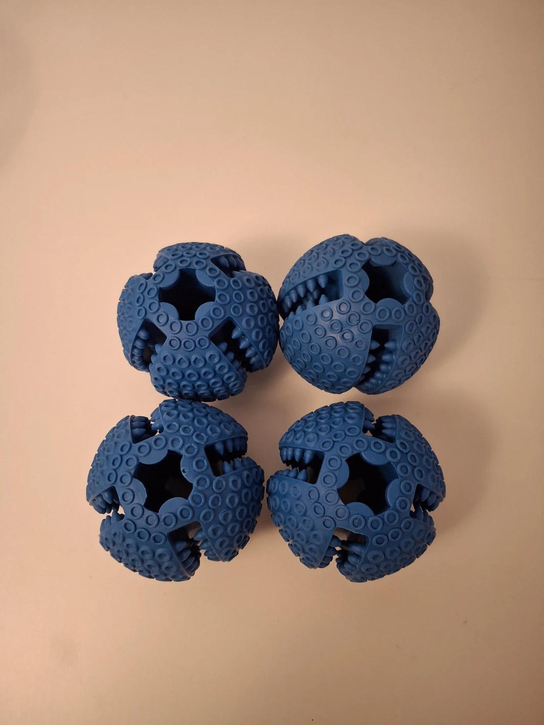 Four blue dog treat dispensing balls.