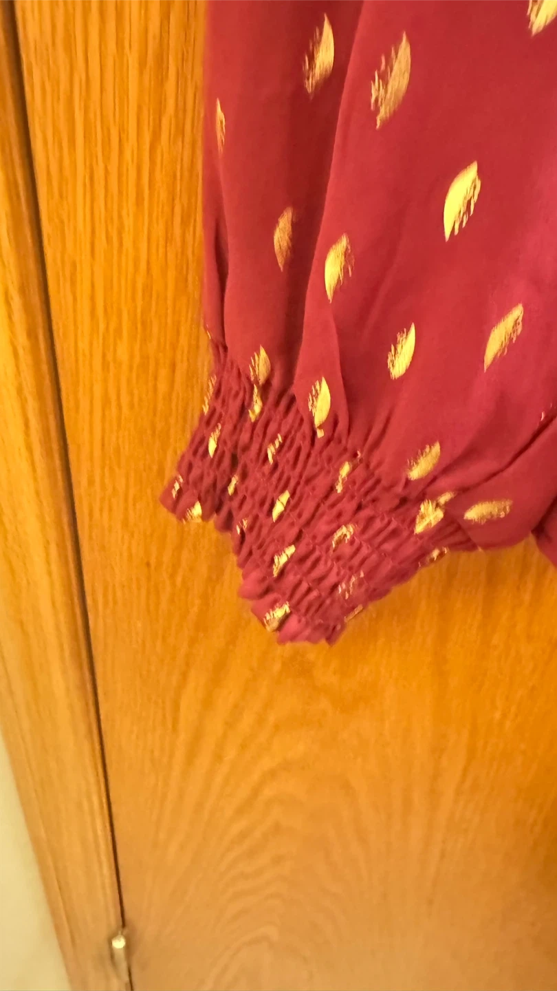 A beautiful Cleo blouse in size XL! The colour is a lovely burgundy/ hot pink with a gold leaf-like pattern throughout. It features long sleeves with a smocked cuff, and a round neckline. The tag is still attached, and it was originally bought for $49.90.