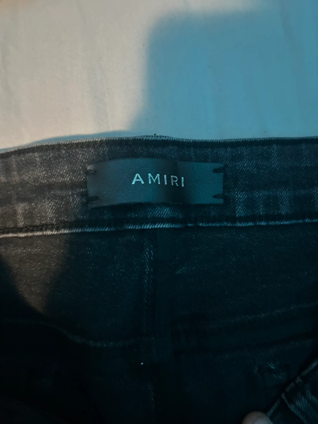 Selling a pair of AMIRI black distressed jeans. They're in great condition and have a stylish, edgy look with the distressed details and the AMIRI logo on the leg. Perfect for adding a bit of rock 'n' roll to your wardrobe!