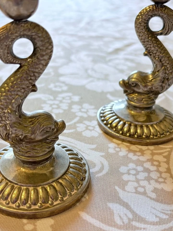 Light up your home with this pair of vintage silver-plated dolphin candlesticks, ideal for adding shine and charm to your holiday gatherings. Their sculptural dolphin bases glisten beautifully in candlelight β a true conversation piece!