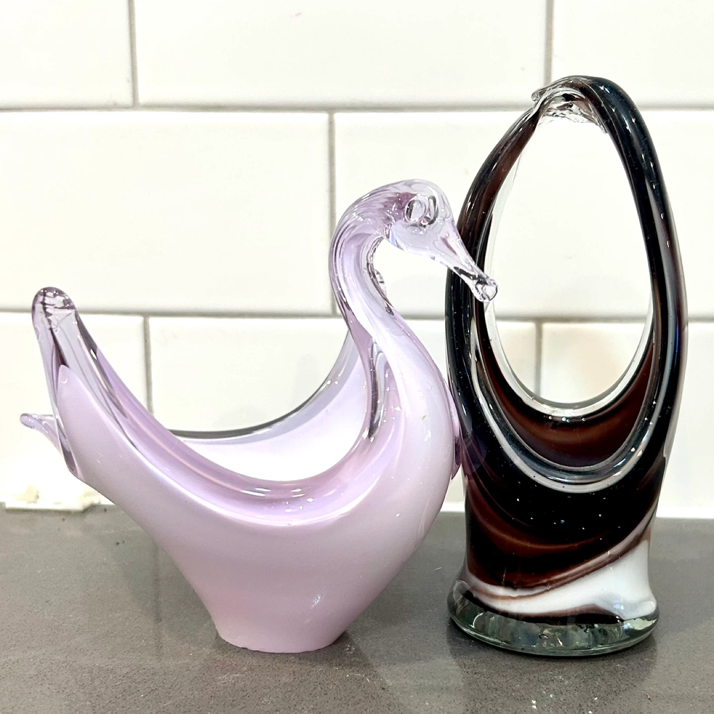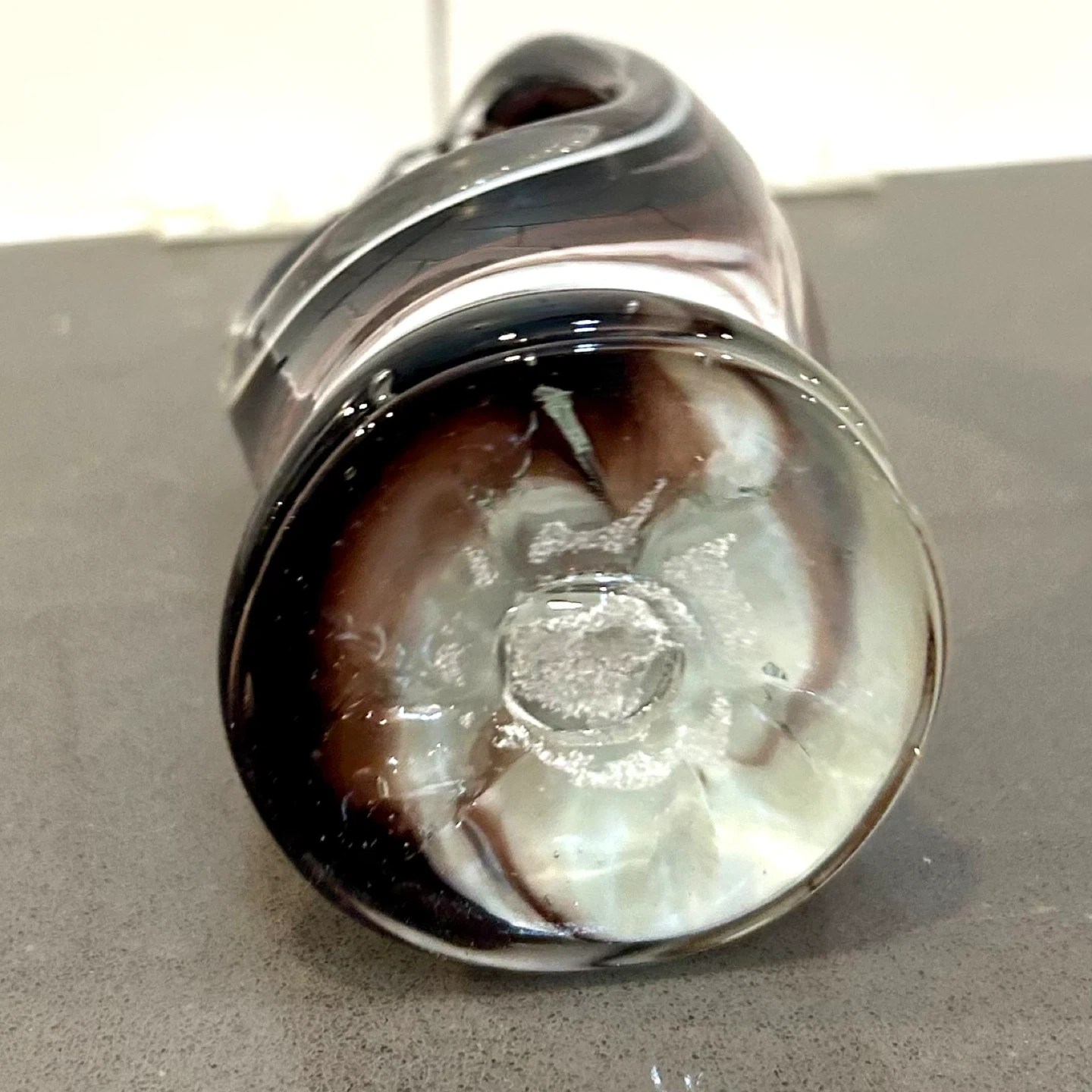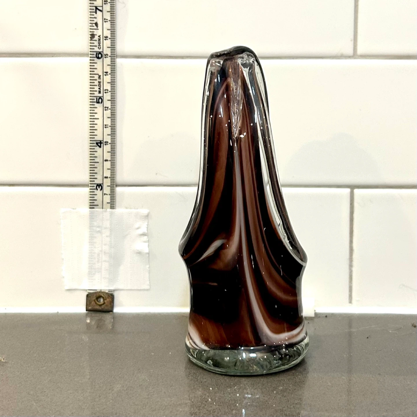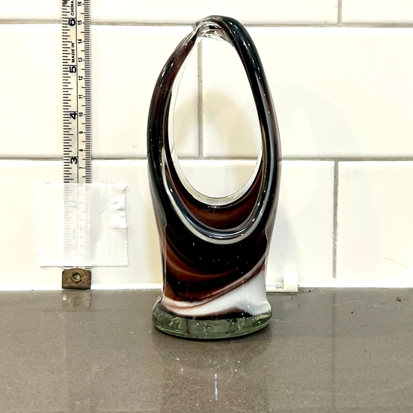 Here's a beautiful glass vase with a unique brown and white swirl design! It measures approximately 7 inches tall, making it a lovely decorative piece for any room