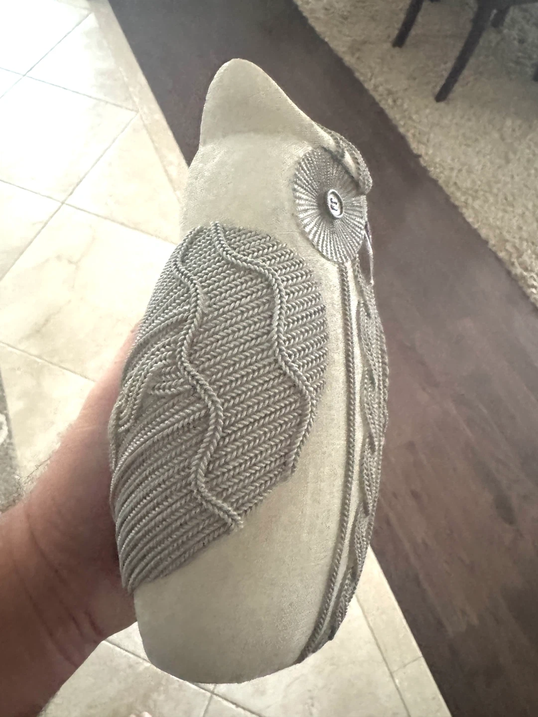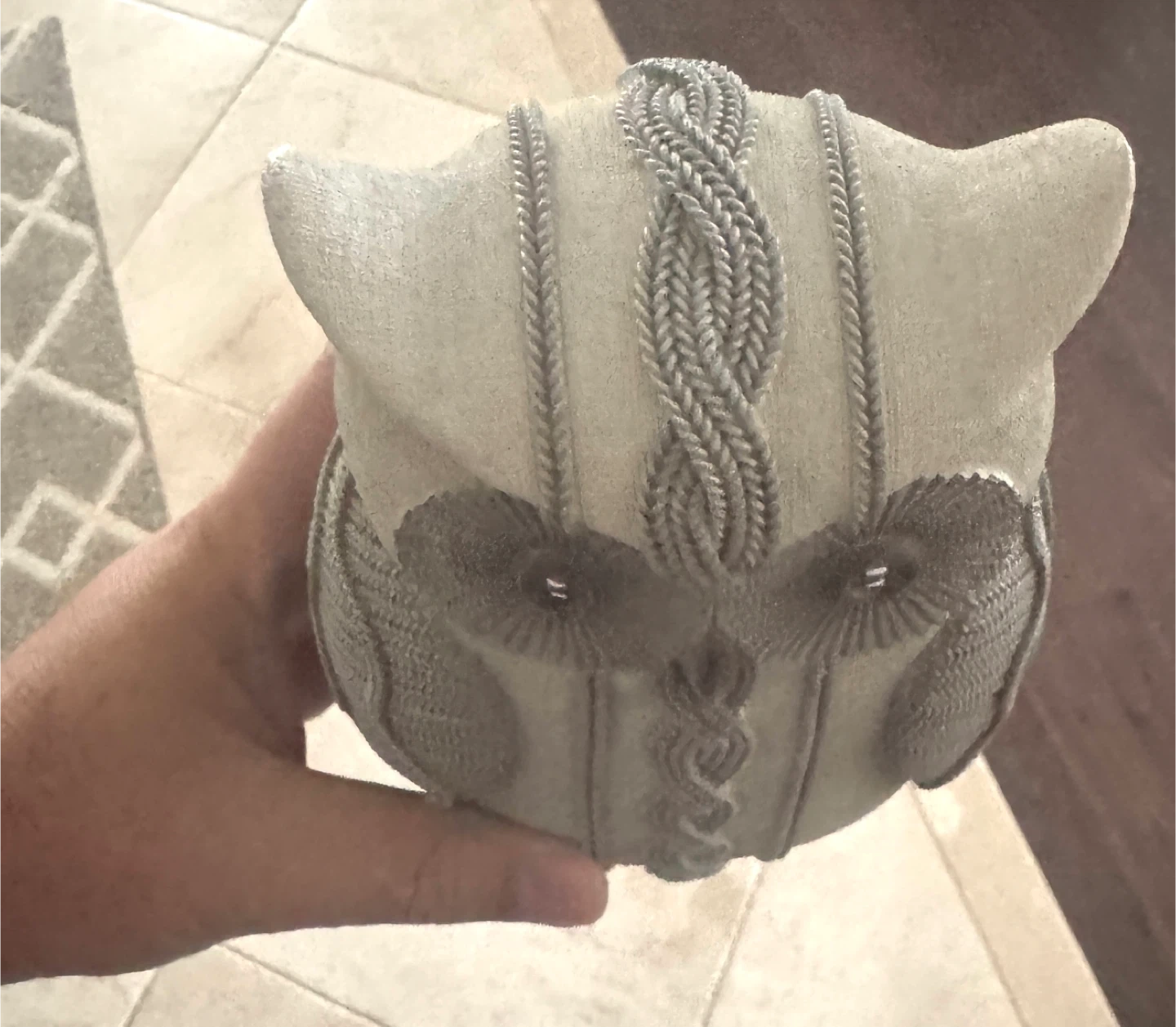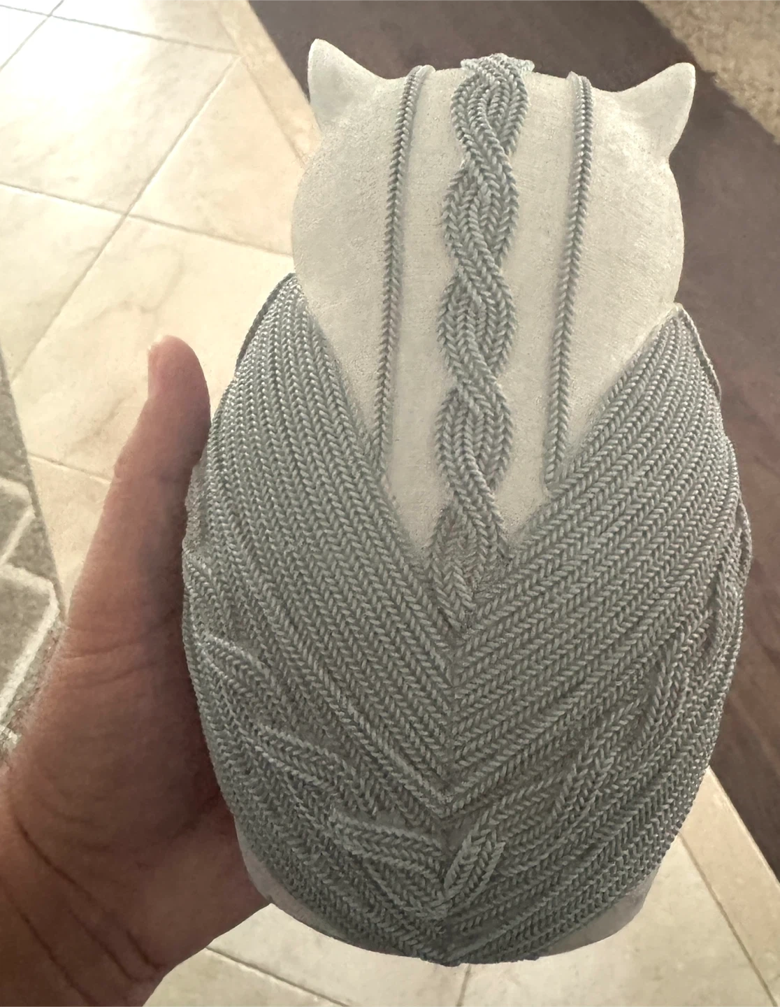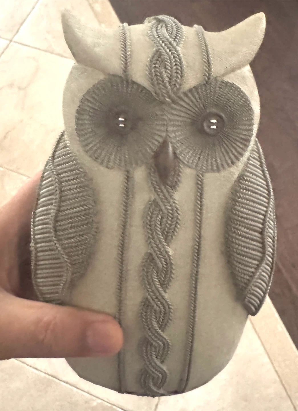 Cute owl figurine for your home! It's in great condition and would look lovely on a shelf or table. It has a unique knitted design.
