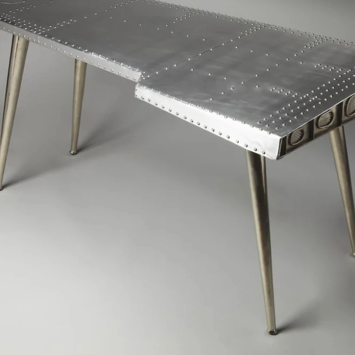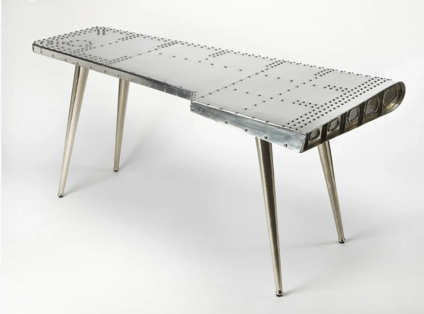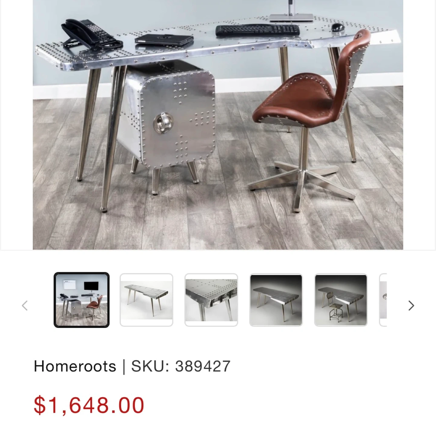 Selling a Homerroots Aviator desk. It's a stylish piece that would look great in any home office or workspace. The desk features a unique riveted aluminum design reminiscent of vintage aircraft. It's a sturdy and eye-catching piece! Purchased for $1600