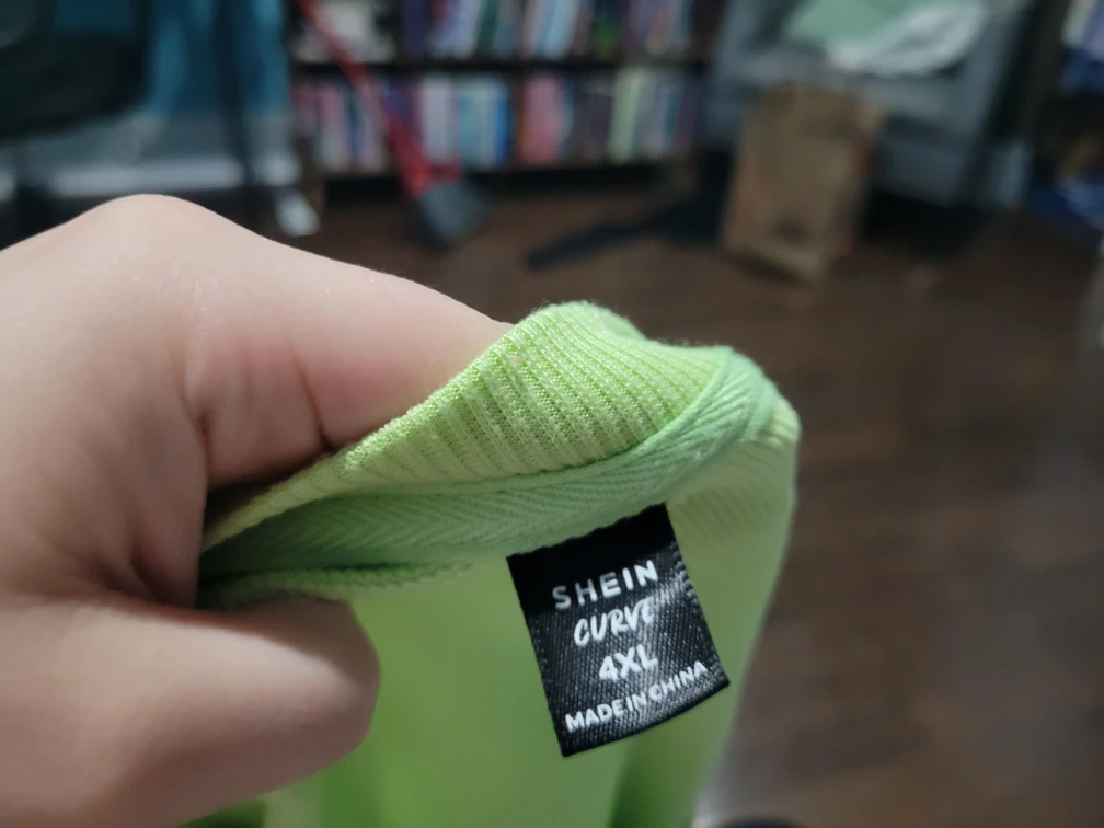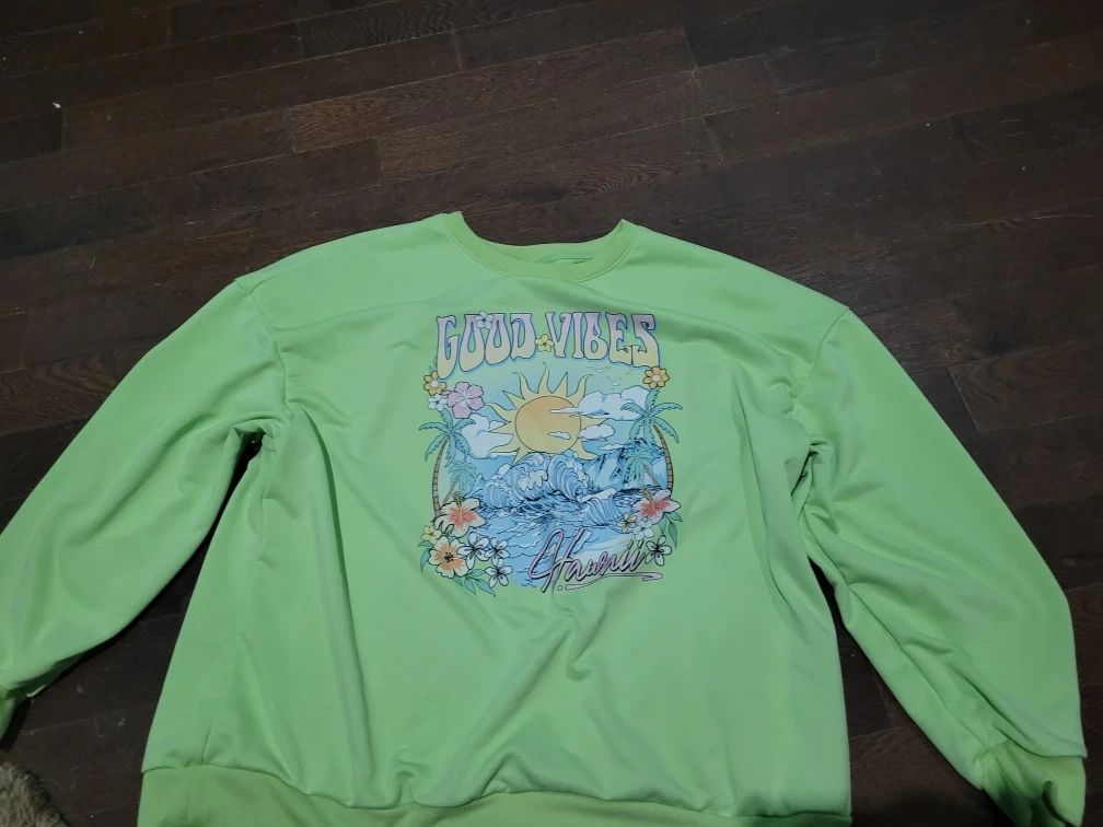 Selling a Shein Curve sweatshirt in size 4XL. It's a light neon green colour with a "Good Vibes Hawaii" design on the front