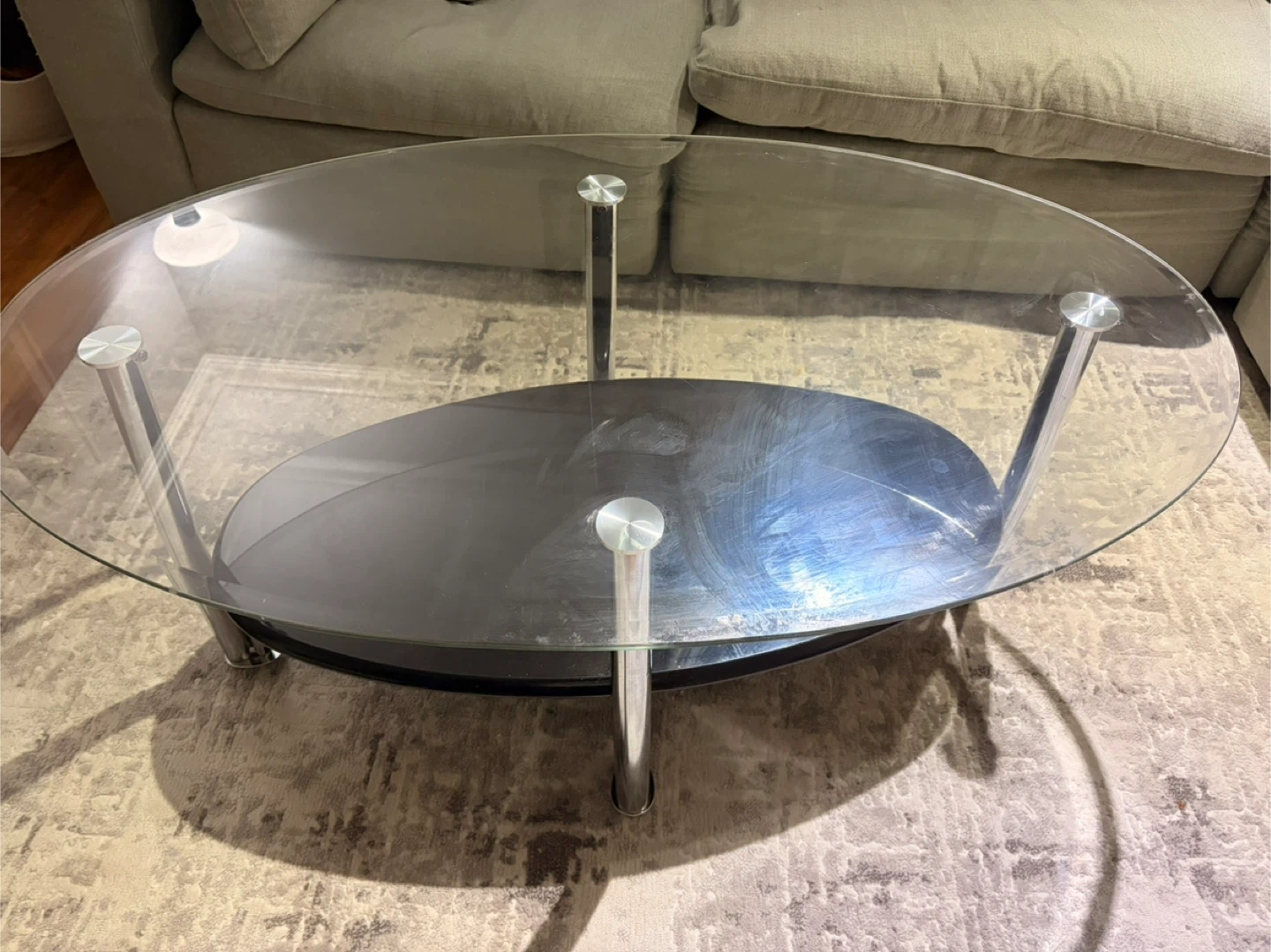 Selling a stylish oval glass coffee table! It features a clear glass top and a black lower shelf, supported by chrome legs. It's in good condition and would make a great addition to any living room