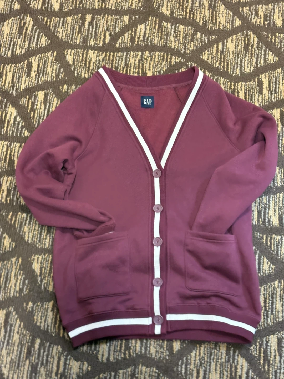 Selling a cute burgundy cardigan from Gap! It's a size small and in great condition. Perfect for layering or wearing on its own. The white trim adds a nice touch!