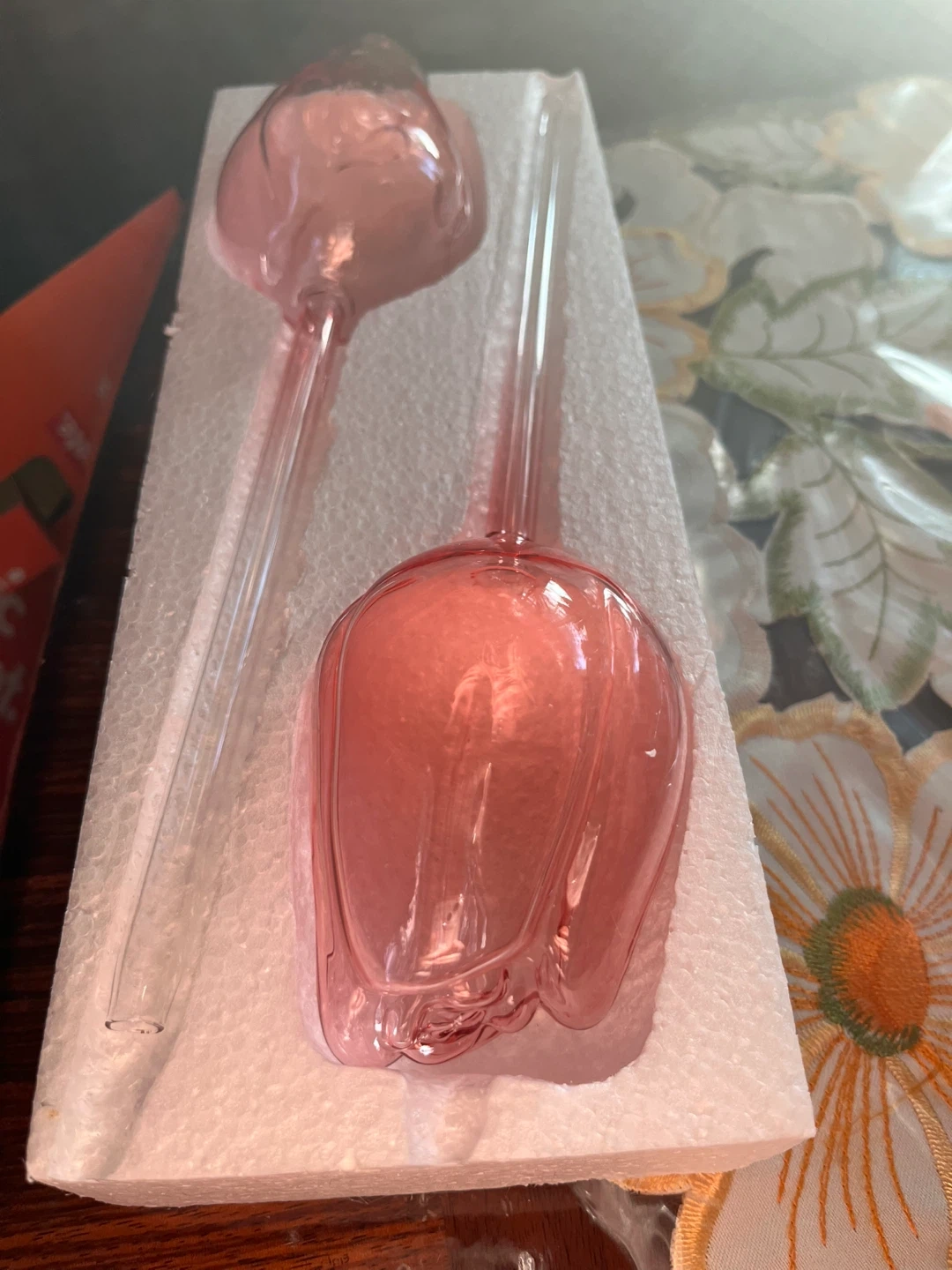 Brand new pink glass tulip shaped water feeders for your plants! These are great for keeping your plants hydrated while adding a touch of elegance to your home