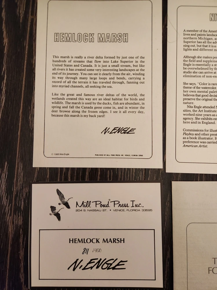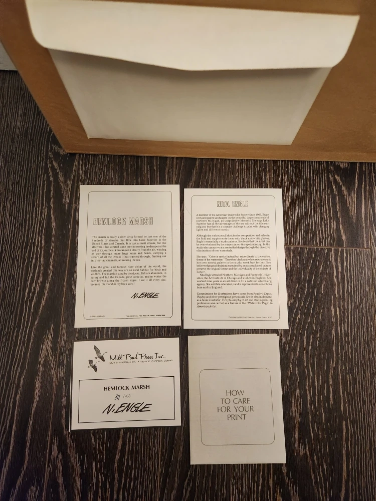 Beautifully framed print titled "Hemlock Marsh" by N. Engle. This piece is originally from Nature's Window Art Gallery. It comes with information cards about the print and artist. A lovely addition to any home! Roughly 30 inches x 18 inches and weighs 9 lbs.