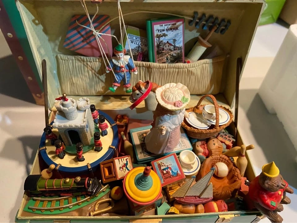 Enesco Toy Symphony-Treasure Chest of Toys Animated Music Box, in Excellent Vintage Condition and Working Order. Comes in Original Box. Produced in 1986, Vintage. Collectible. -Wind-up on back plays the tune “Toy Symphony”. Works perfectly. -The music and animation are started by gently pushing the hobbyhorse to the left, and stopped by pushing the horse to the right… As seen in video. -As the music plays…soldiers move around the castle, the toy top spins, and the doll moves side to side…As seen in video. -Has all working parts, nothing broken or missing. Approx Measurements: 8” High, 8” Long, 6” Deep. Cash only. *Meet in Garfield Ridge, Chicago, near Midway. *Willing to meet near Oak Lawn, EP, Alsip, Orland, Palos, Burbank, Bridgeview, Countryside, LaGrange, Burr Ridge, Darien. ☺️