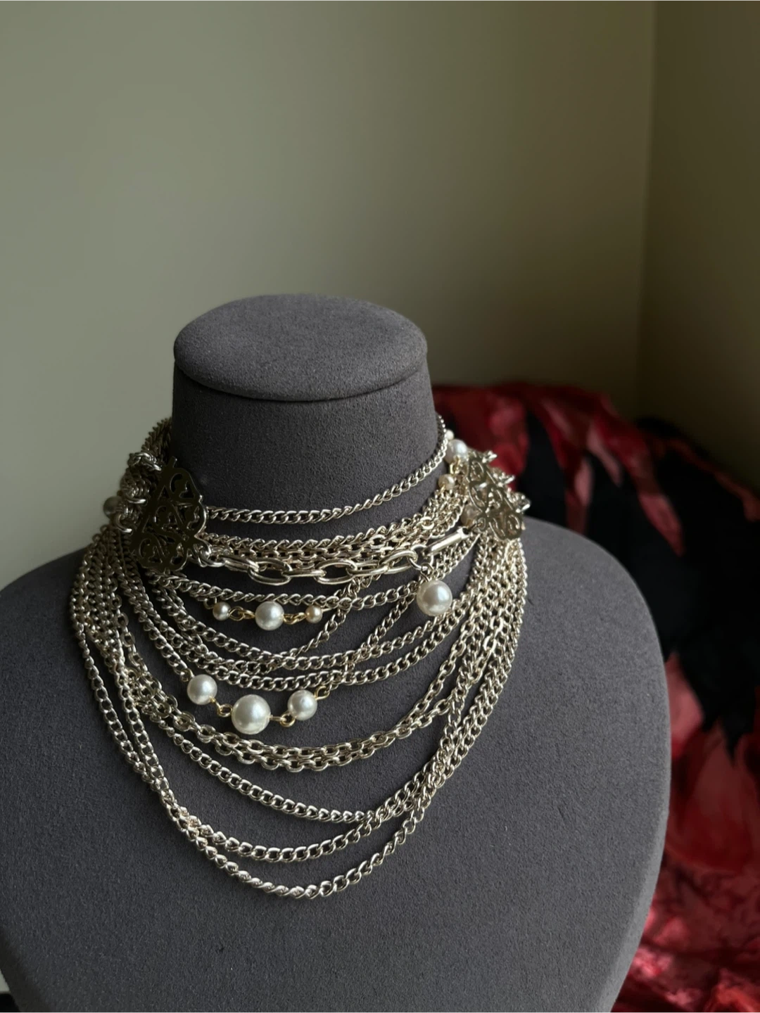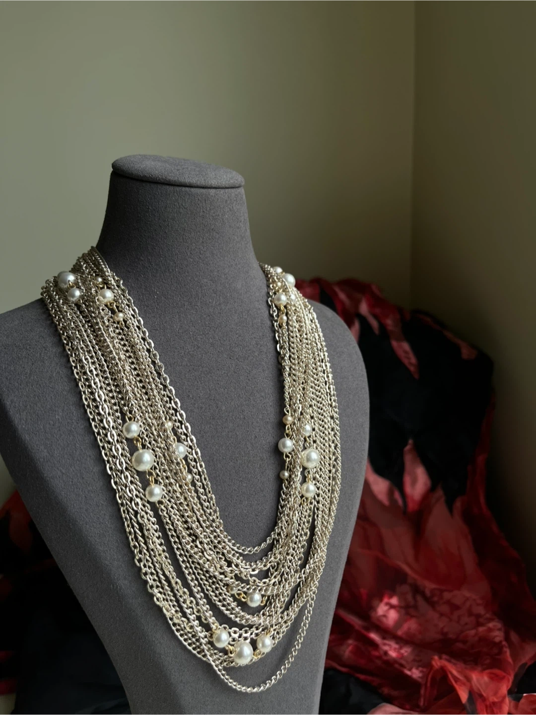 Layered multi-strand chunky silver Pearl Chain Necklace