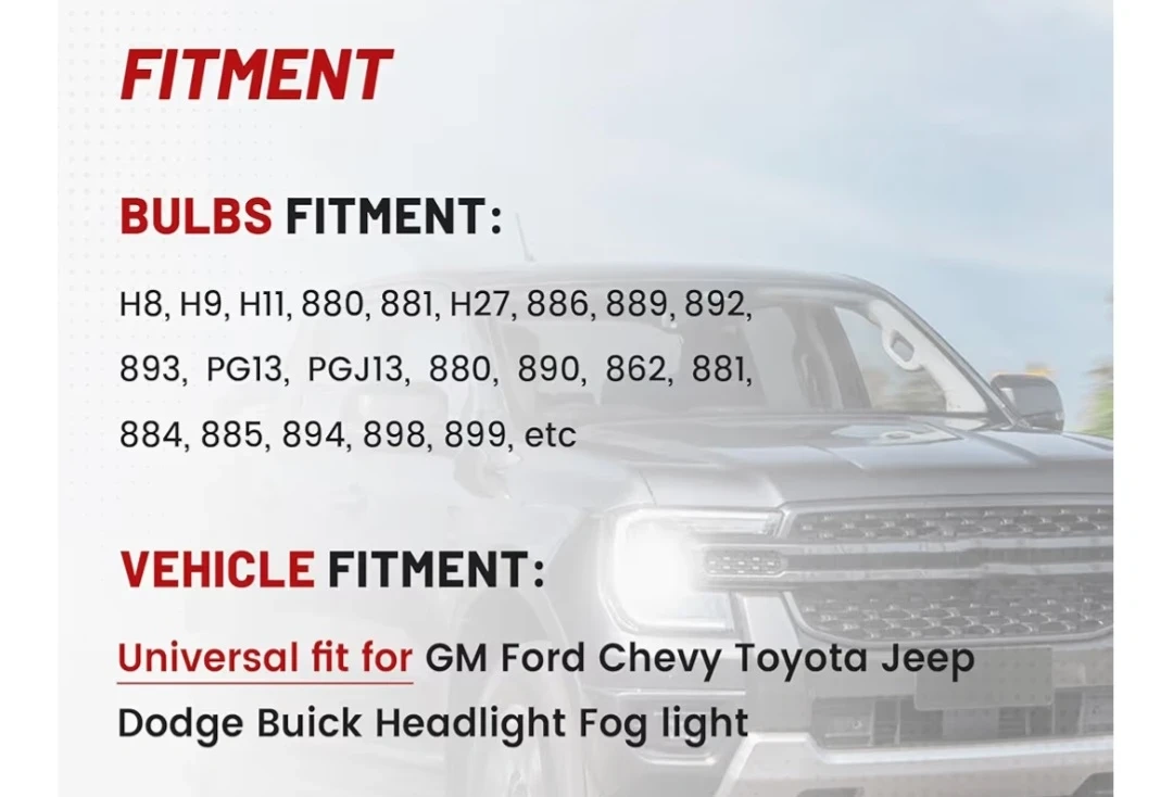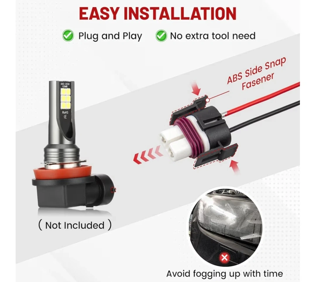 Selling a H11 H8 front light wiring connector. It features a perfect match plug, silicon sealing rubber, never melt ceramic plug, and pure copper wire. Easy installation with plug and play, no extra tool needed. It also has an ABS side snap fastener