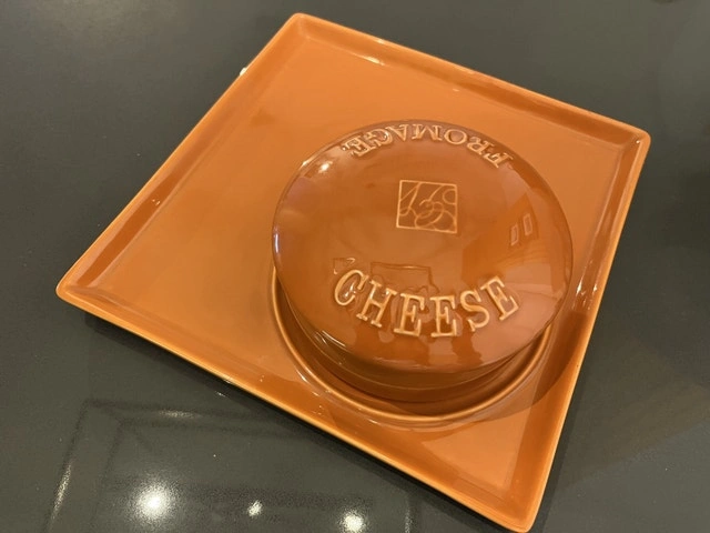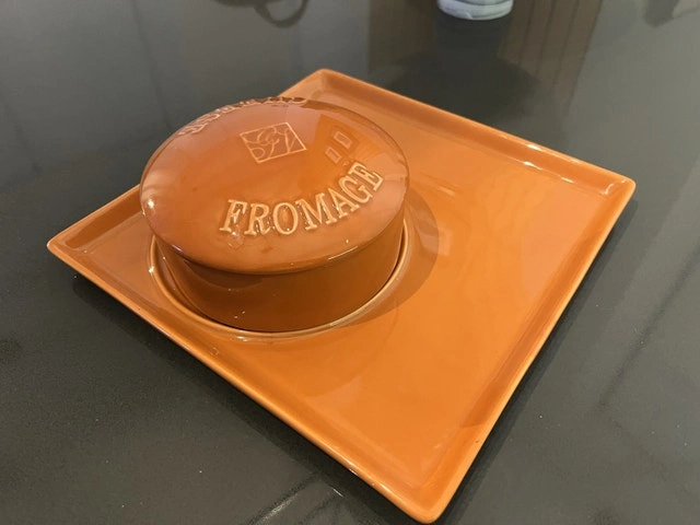 Add a touch of French country charm to your kitchen with this delightful cheese fromage set! This set includes a round earthenware pot with the word 'Fromage' on it and a square earthenware plate. This set is used but is in great condition!