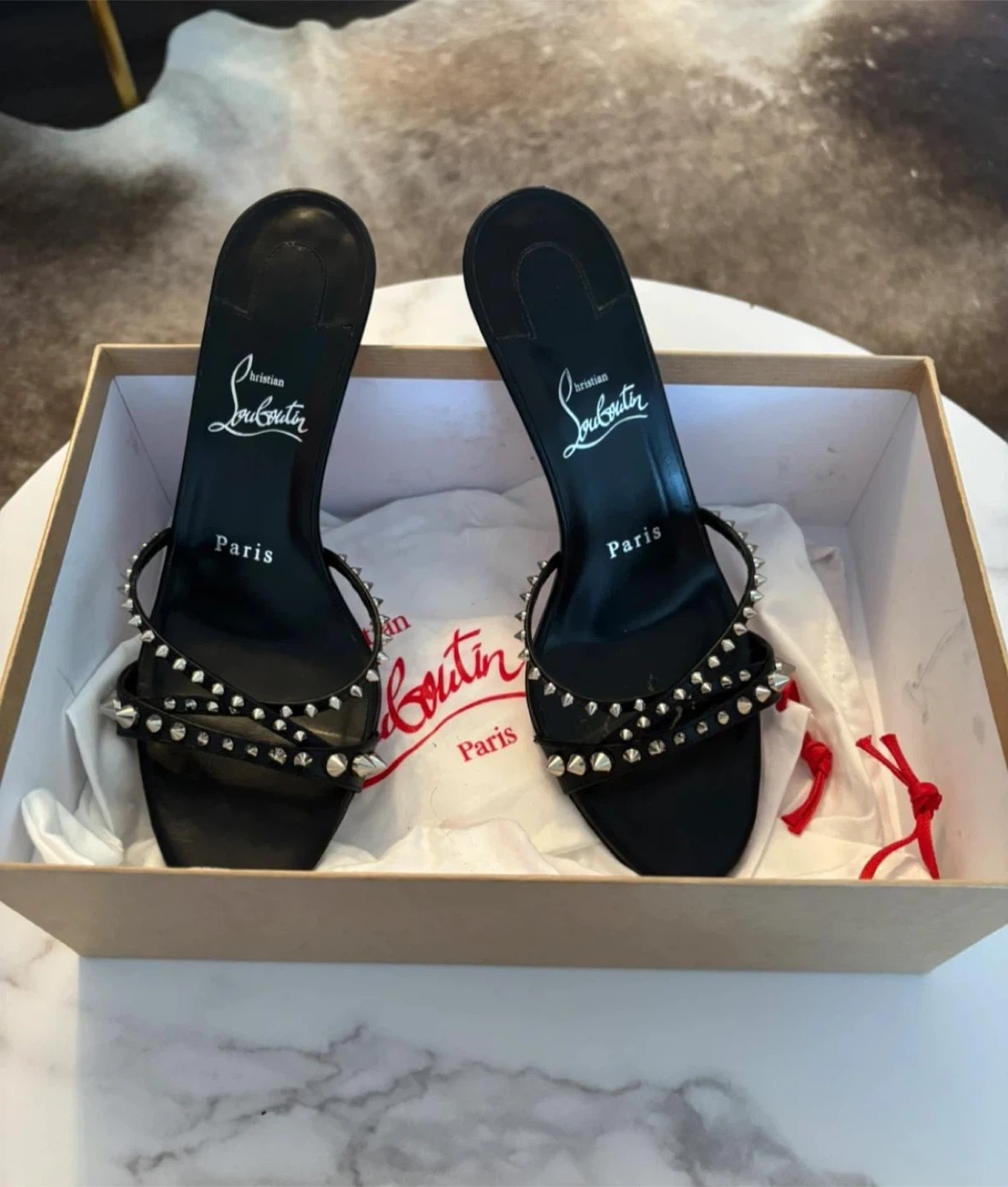 These Christian Louboutin heels are a stylish addition to any wardrobe! They feature a sleek black design with edgy spike detailing. The iconic red soles add a touch of luxury. Comes with the receipt original box and dust bag!