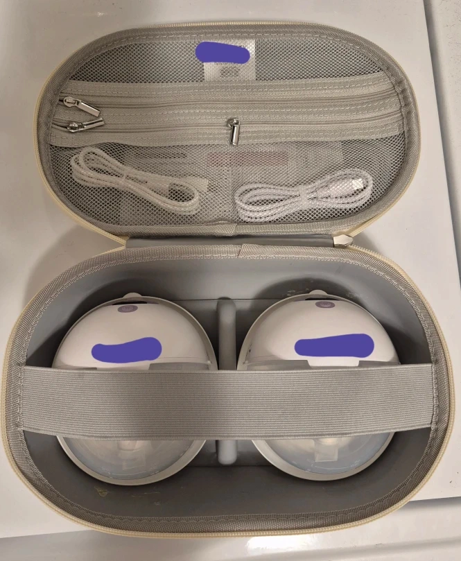 Selling a wearable breast pump (Momcozy M5) that comes with a convenient carrying case. It includes the charging cables for both pumps. This hands-free pump is perfect for busy moms!