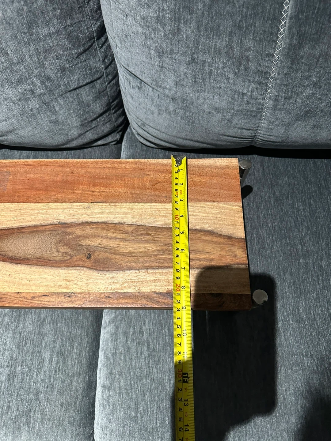 Selling a small wooden side table. It has a beautiful wood grain pattern and metal legs. The dimensions are approximately 17 inches in length and 10 inches in width