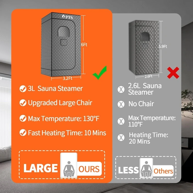 36"*36"*71" Full Size Sauna】The widened full size steam sauna room can easily accommodate two adults. You can stand or sit in it. If you'd prefer to sit, we provide a waterproof folding chair for added comfort, with the chair supporting over 440 pounds. Providing you with a spacious and comfortable experience