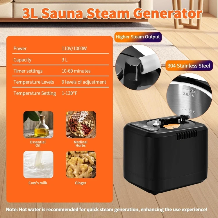 【3L Large Capacity Steam Generator】It features a high-capacity, high-performance steam generator that includes a number of safety features, including anti-dry burning, anti-leakage, explosion-proof, automatic power-off protection design. The steam generator with a 304 stainless steel inner tank ensures long-lasting use. The included remote control allows you to operate the steam generator from within the sauna. It also features a larger steam box for holding aromatherapy herbs