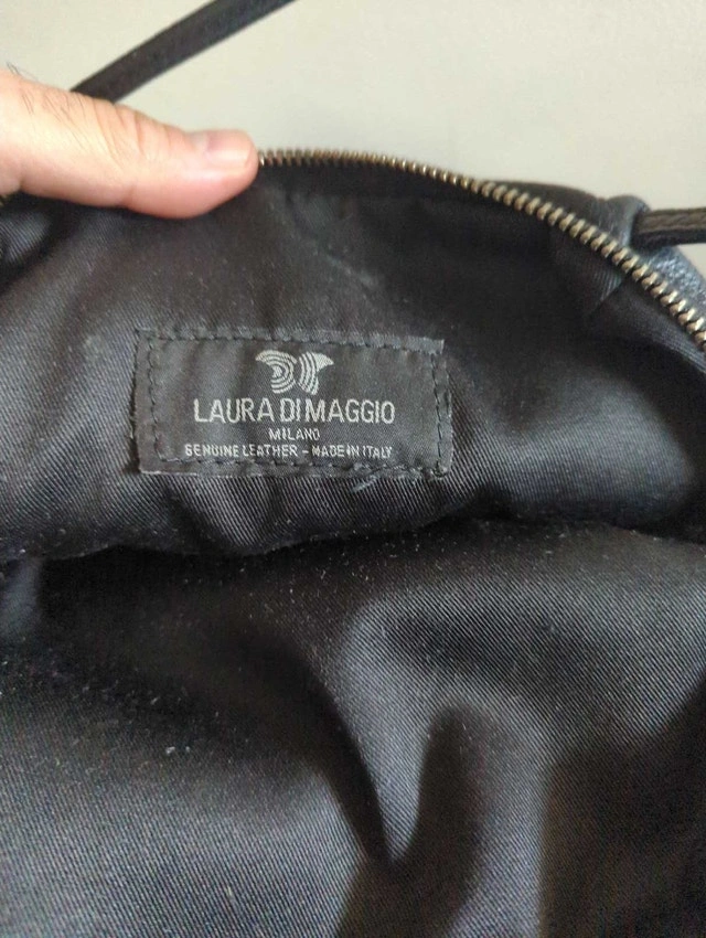 This is a pre-owned Laura Di Maggio Milano genuine leather handbag made in Italy, offering a touch of Italian craftsmanship. With its compact size and classic design, it's perfect for everyday use or a night out. The bag features a secure zippered closure and a comfortable handle.