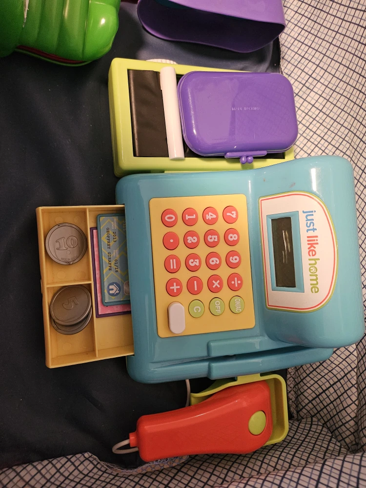 Free toy cash register. It comes with all the accessories you see in the pictures, including play money, coins, and a pretend credit card scanner.
